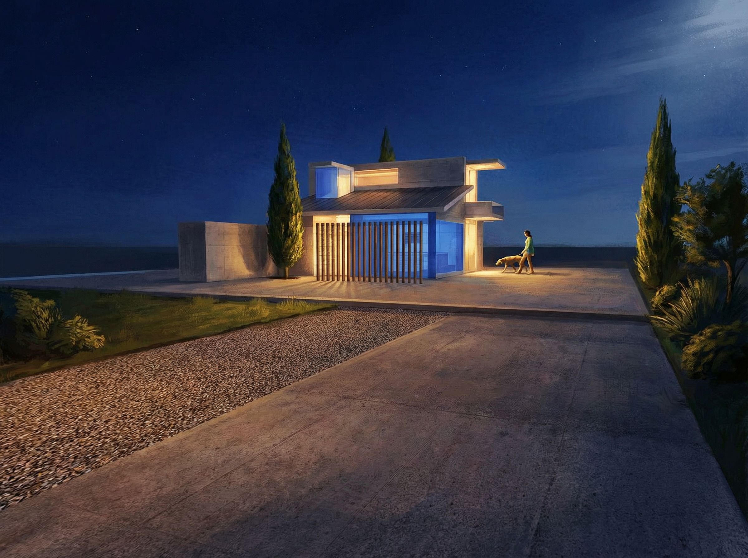 Promptarchitectural sketch, render this sketch into artistic illustration, contemporary, keep exact camera angle, night scene with ambient lighting, high quality, professional, detailed scene