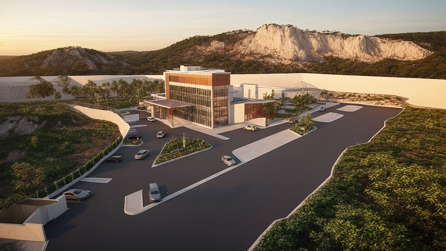 Daylight, warm sunset, hospital, busy, modern, plaster, plants