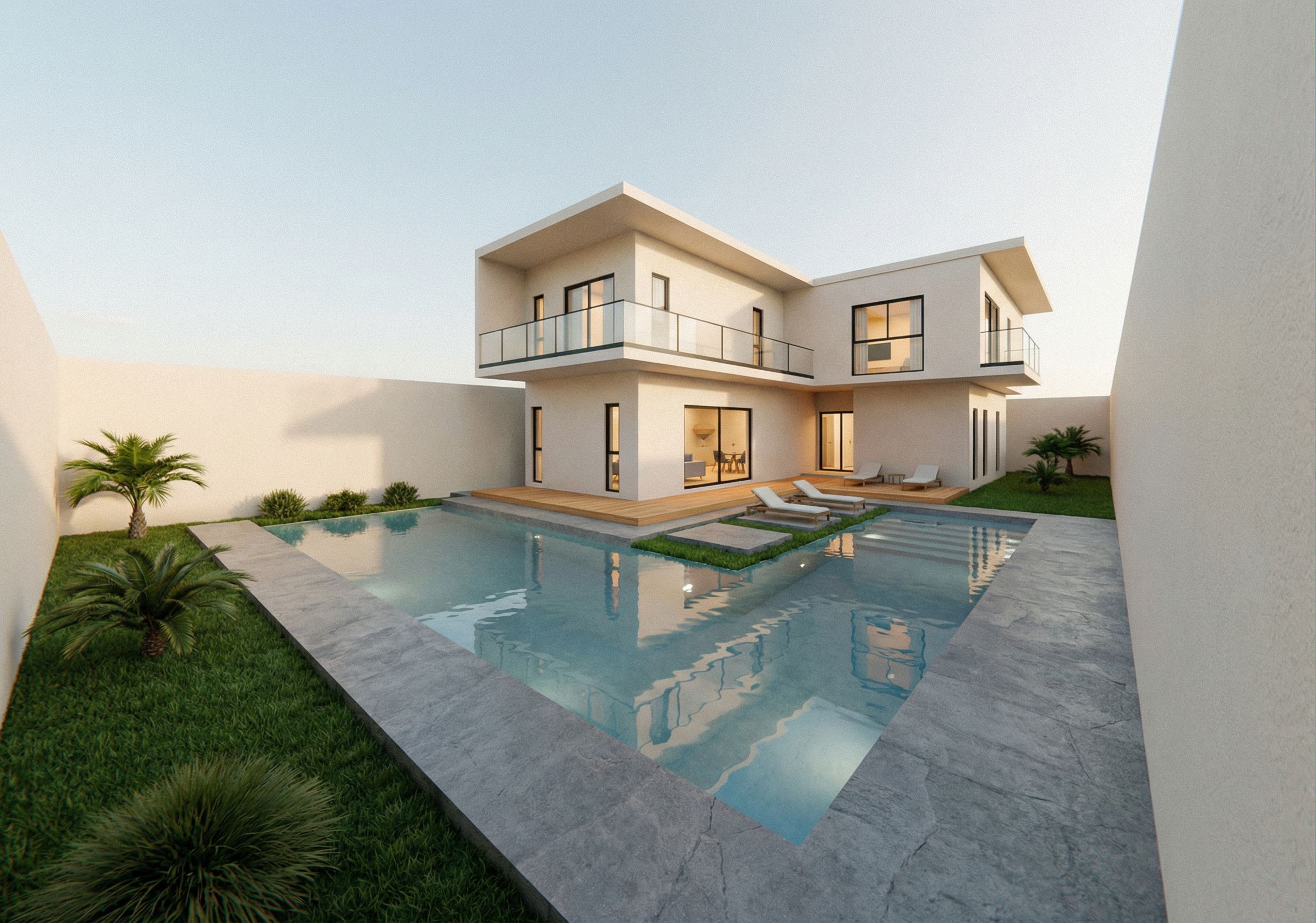 PromptUltra photorealistic architectural render of the provided R+1 modern minimalist villa based strictly on the reference image. π¨π¨π¨ STRICT GEOMETRY PRESERVATION (ABSOLUTE β NO MODIFICATION ALLOWED) Use the reference image as ABSOLUTE and ONLY base The architecture must be treated as FINAL and UNTOUCHABLE βββ DO NOT MODIFY ANYTHING UNDER ANY CIRCUMSTANCE NO redesign NO reinterpretation NO optimization NO proportional adjustment NO addition or removal of elements π PRESERVE EXACTLY (1:1 MATCH REQUIRED) building volumes proportions openings roof terrace balcony design faΓ§ade composition edges and alignments landscaping layout from reference camera angle (STRICTLY IDENTICAL) β οΈ AUTHORIZED CHANGES ONLY The AI is ONLY allowed to enhance: materials realism lighting quality vegetation realism interior staging π« Everything else is strictly forbidden π ARCHITECTURAL STYLE Modern minimalist villa High-end residential standard Clean, elegant, sharp geometry π¨ MATERIALS Main faΓ§ade: soft warm off-white / ivory white stucco (crΓ©pis) (slightly warm, not pure white, not beige β very soft and luminous) Frames: matte black aluminum π ENVIRONMENT Conakry, calm gated residence Flat terrain Peaceful upscale atmosphere πΏ LANDSCAPING (STRICT FROM REFERENCE IMAGE β COLOR CODED) π¨ The landscaping must strictly follow the color-coded reference image. No interpretation allowed. Blue areas in the reference image = L-shaped swimming pool clear, slightly reflective water perfectly clean geometry matching the reference Gray areas surrounding the pool = raw natural stone flooring slightly irregular texture natural stone look (not tiles, not concrete) Red areas in the reference image = wooden terrace light teak wood decking satin finish clean modern layout Green areas in the reference image = natural grass slightly organic, not artificial-looking soft and realistic lawn π΄ VEGETATION Small palm trees Low shrubs Minimalist composition Carefully placed, not dense πͺ EXTERIOR FURNITURE Minimalist modern sun loungers Clean outdoor setup No clutter π‘ INTERIOR (VISIBLE THROUGH GLASS) Furnished interior: modern minimalist sofa elegant dining table contemporary chairs coffee table Clean architectural kitchen volumes (if visible): minimalist cabinetry only no visible appliances Interior style: warm neutral tones high-end finishes refined and uncluttered π‘ LIGHTING DESIGN Interior: warm ambient lighting soft glow visible from outside Exterior: surface-mounted spotlights on balcony ceilings modern minimalist fixtures Global lighting: soft natural daylight calm atmosphere πΈ CAMERA π¨ STRICT RULE: KEEP EXACT ORIGINAL CAMERA ANGLE β NO CHANGE, NO SHIFT, NO REFRAMING Slight cinematic enhancement allowed ONLY in lighting and depth Composition must remain identical to reference π₯οΈ RENDER QUALITY Ultra photorealistic Luxury real estate visualization Realistic reflections Detailed materials 8K resolution HDR lighting Sharp, clean output π« FINAL HARD LOCK (VERY IMPORTANT) No redesign, no geometry change, no modification of architecture, no change in proportions, no added elements, no removed elements, no reinterpretation, strictly identical model enhancement only., keep exact camera angle
