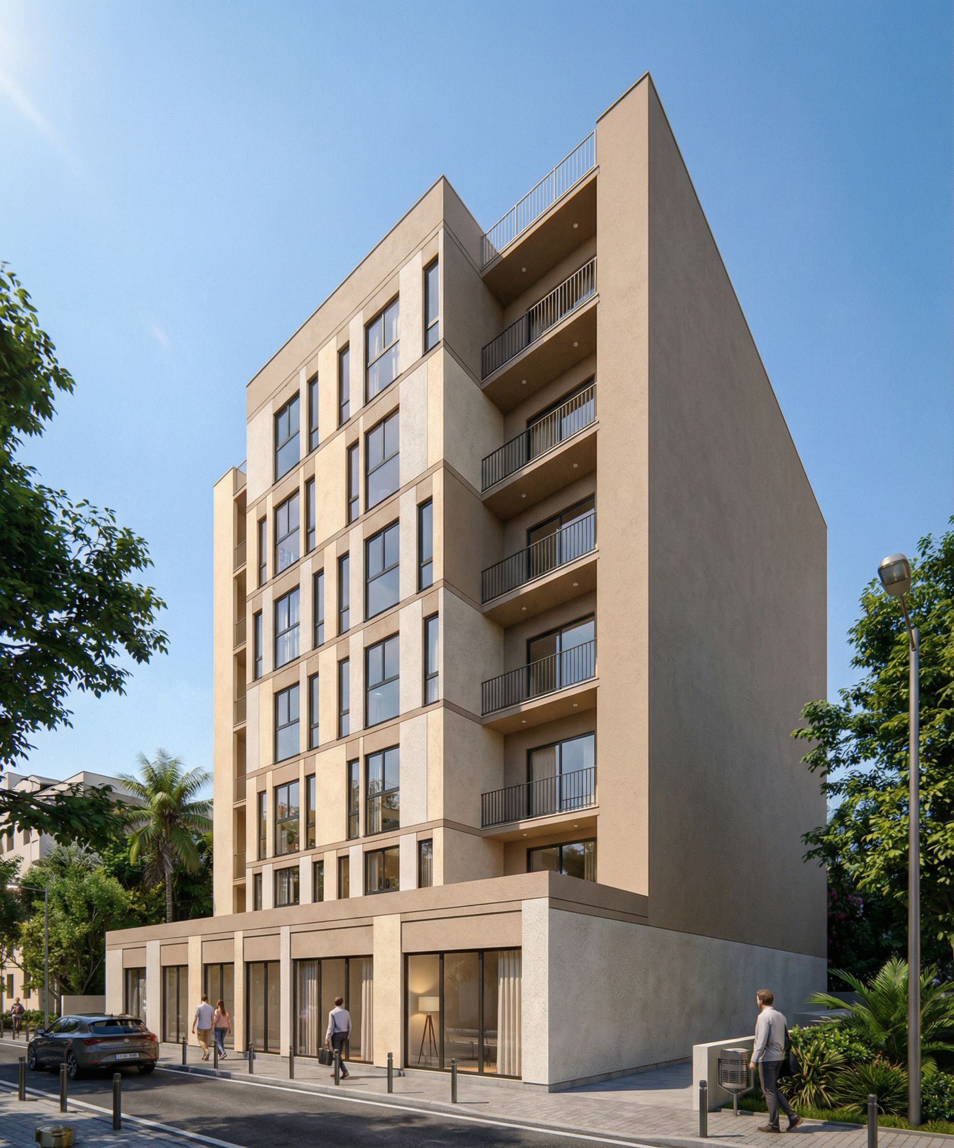 Ultra realistic architectural render of the provided building model. STRICTLY KEEP ORIGINAL GEOMETRY – NO MODIFICATION OF BUILDING SHAPE, volumes, window placement, balconies, slabs or proportions. Apply a contemporary façade treatment using textured stucco crépis panels in a vertical patchwork composition. Use warm neutral tones: light beige, sand, taupe, soft greige and warm stone. Subtle variation in texture fine grain mineral plaster, slightly rough stucco, brushed finish. Clean vertical segmentation with sharp joints. Recessed balconies with darker inner tones for depth warm taupe shadows. Window frames in matte black or dark bronze aluminum. Elegant thin metal railings. Add warm recessed ceiling spotlights in all balconies integrated in slab soffits. Lighting temperature around 2700K–3000K warm white. Soft light wash effect on balcony walls. Subtle indirect glow under balcony ceilings. Add realistic interior apartment lighting visible through windows: warm ambient lighting, floor lamps, pendant lights, soft living room glow, subtle bedroom lighting. No overexposure. Natural lived-in feeling. Variation between units some brighter, some dimmer. Time of day: blue hour or early evening. Balanced contrast between warm artificial lighting and cool natural sky. Realistic global illumination, soft shadows, ambient occlusion, micro material detail. Photorealistic, 4K resolution, architectural visualization, premium residential tower atmosphere. this is the prompt for the correction : Ultra realistic architectural render of the provided building model. STRICTLY KEEP ORIGINAL GEOMETRY – NO MODIFICATION OF BUILDING SHAPE, MASSING, OPENINGS, BALCONY DEPTH OR STRUCTURE. The right lateral façade balcony side is a party wall mitoyenneté. It must remain a full solid wall. No texture variation, no patchwork composition on this façade. Use a uniform stucco finish single neutral tone. The balcony on the right side does NOT wrap around. There must be no corner return balcony. Close any artificial void previously created. Replace the empty corner with a full solid wall exactly as in the original model. Respect strictly the original balcony alignment and slab thickness. Do not create new openings. Do not extend balconies. Apply the textured stucco patchwork composition ONLY on the main front façade. Maintain realistic warm balcony spotlights 2700K–3000K. Keep soft interior lighting visible through windows, natural and not overexposed. Lighting: early evening or blue hour. Realistic shadows, high material definition, precise edges, architectural visualization quality. Photorealistic 4K render, accurate proportions, clean geometry preservation., keep exact camera angle