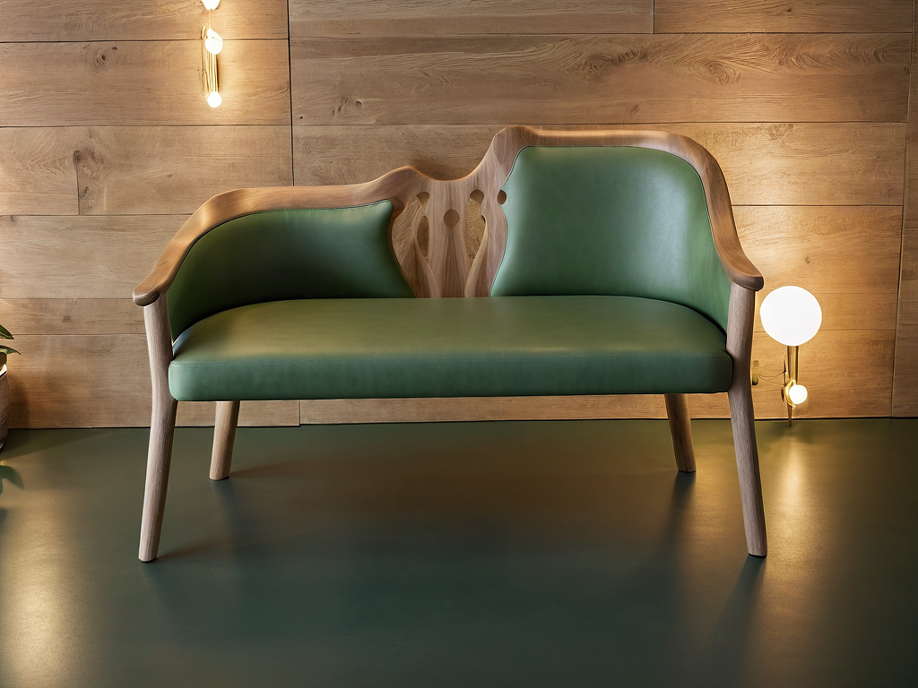 Promptmodern bench, green leather back, soft green fabric seating, light wood structure, side view perspective