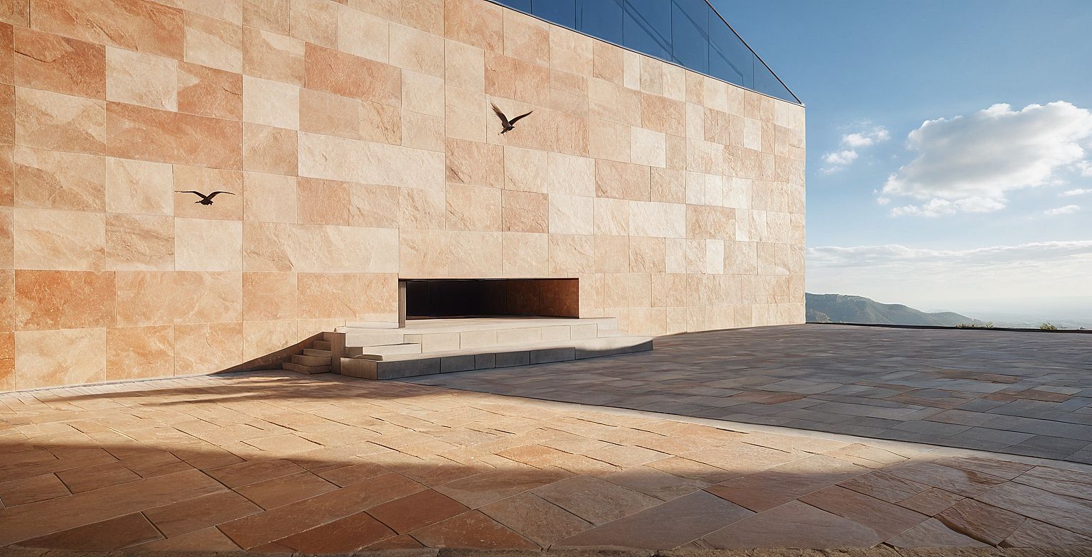 PromptSunny day, floor material is paving stone, brow/ orange areas are sandstone, birds in sky