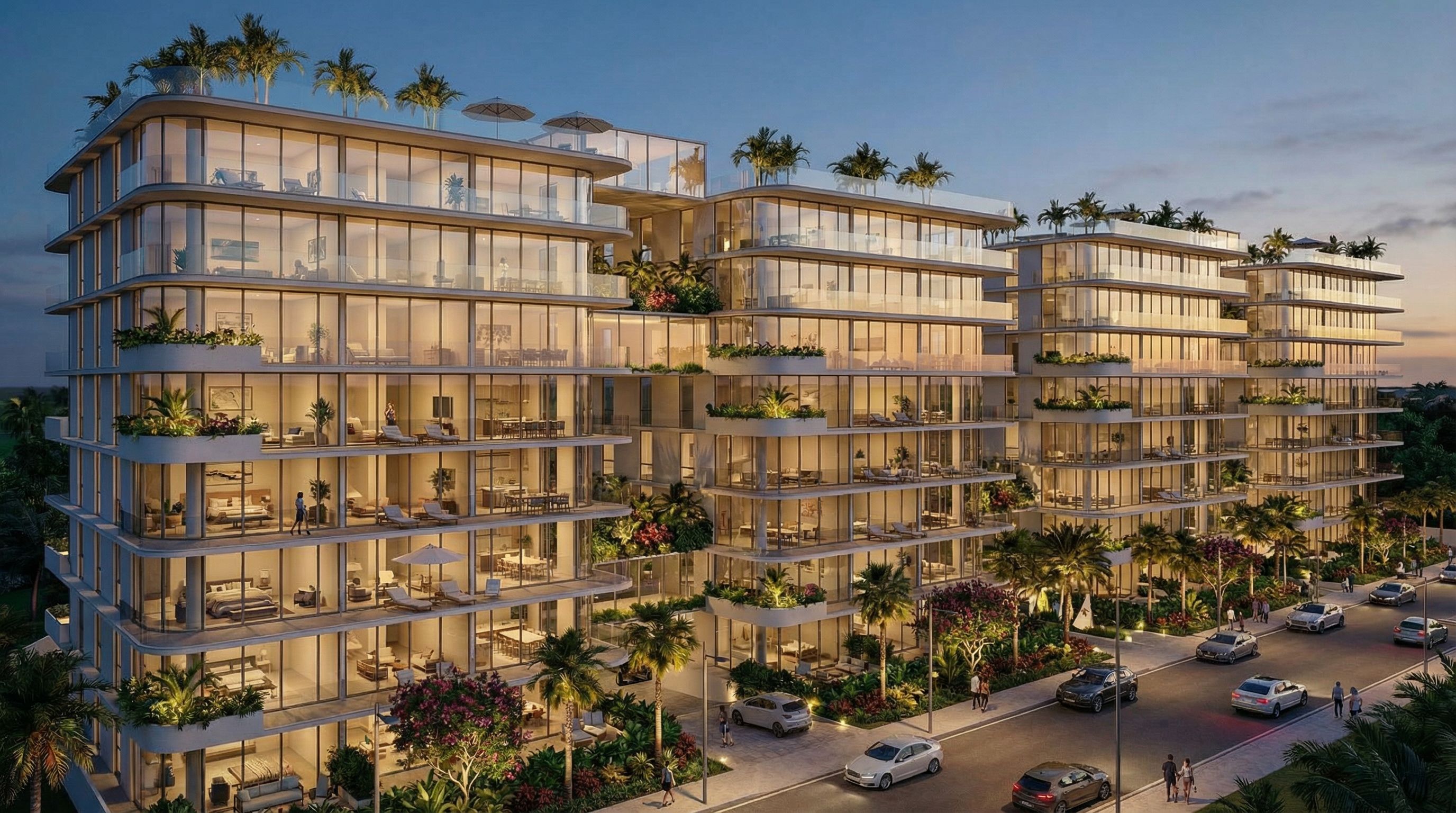 architectural exterior rendering, render this 3D mass into photorealistic rendering, super realistic, with light interior, furnitures beach on the balcony, beautiful plants, light on the vegetation. Photo of contemporary residential buildings, showcasing sleek glass façades and lush terrace gardens. The structure features wide balconies with greenery, enhancing the modern aesthetic. Surrounded by a vibrant urban landscape, nearby palm trees create a tropical atmosphere. Bright, natural lighting highlights the building’s transparent elements, casting dynamic shadows. Captured from a low angle with a wide lens to emphasize the height and design intricacies, the composition invites viewers into this serene, upscale environment., keep exact camera angle, dusk atmosphere with soft lighting, including people, vehicles, greenery and vegetation, trees, street furniture, high quality, professional, detailed scene