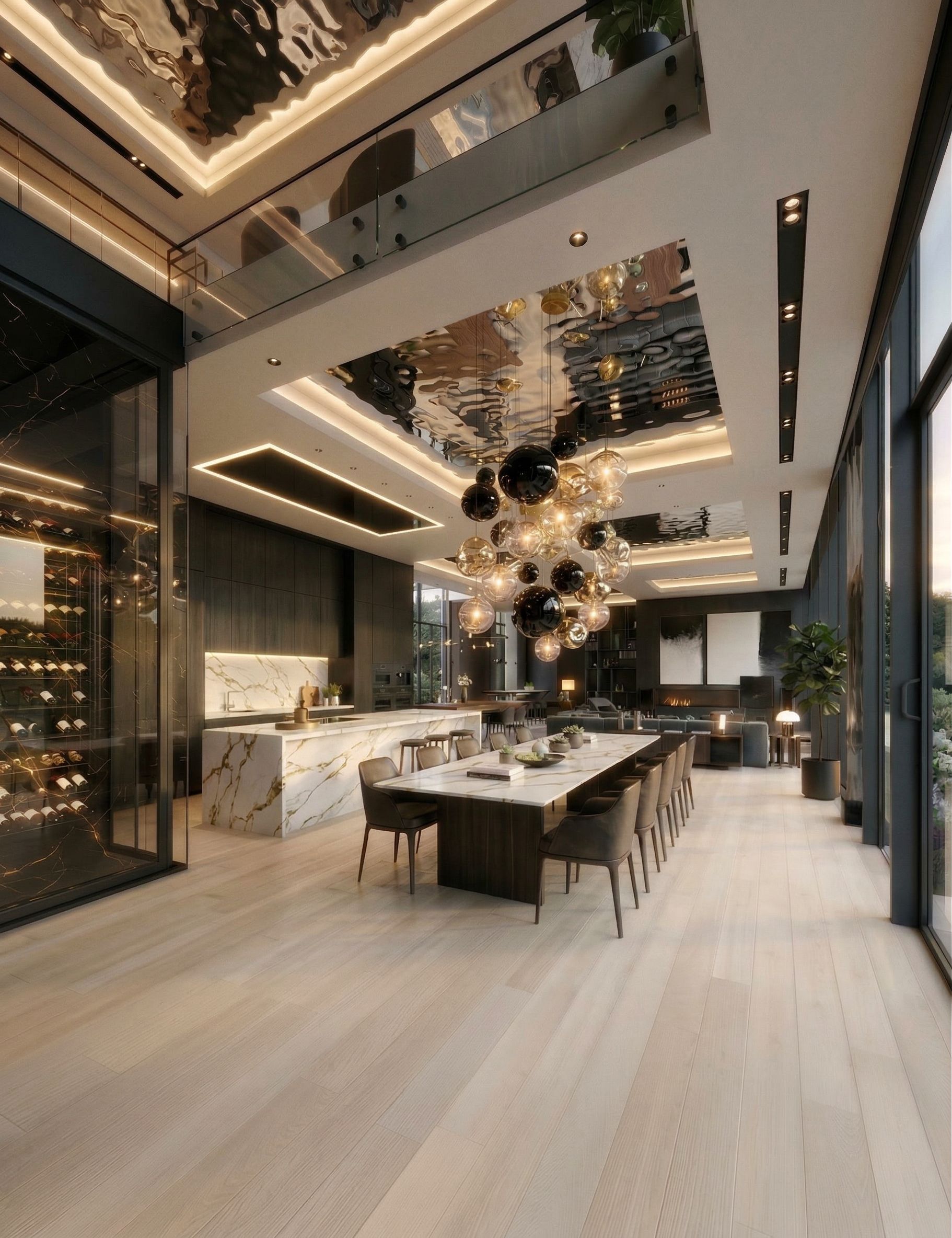 Conserva la arquitectura y la decoración de esta imagen Conserva el mismo tamaño de la imagen en alto y ancho Añade a la lampara que está sobre la mesa algunos globos de cristal negro y aumenta el número globos circulares pero con ciertas deformaciones en su forma y tamaños distintos. Añade más luz al fondo de la imagen para que se vean bien los muebles y los revestimientos pero sin cambiar sus acabados negros. Añade luz lineal sobre los muebles altos de la cocina para que se vean iluminados. Ilumina correctamente los muebles del fondo para se vean con más claridad. haz que se vea con más evidencia la luz lateral de la hora dorada Aclara la imagen para que no se vean tantos contrastes y sombras oscuras., keep exact camera angle