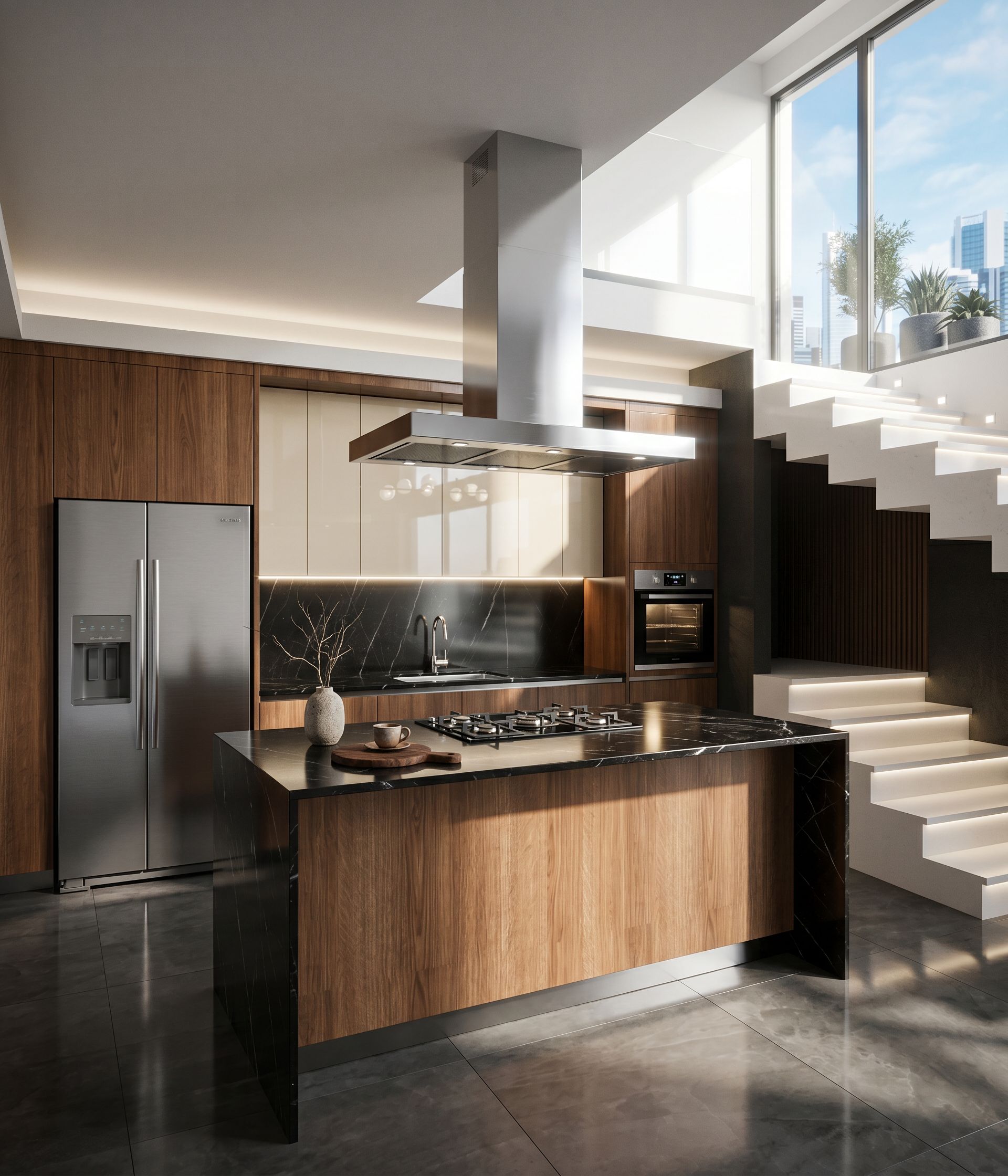 PromptPhoto of a contemporary kitchen in a minimalist home, featuring sleek cabinetry with a mix of wood and high-gloss finishes. Highlight the rich textures of the black marble countertop and backsplash, complemented by modern stainless steel appliances. The space opens to a light-filled area with a large window casting natural light, creating dynamic shadows. A slightly elevated camera angle focuses on the central island, framed by soft, diffused lighting, emphasizing the clean lines and functional layout, ideal for a modern lifestyle., keep exact camera angle