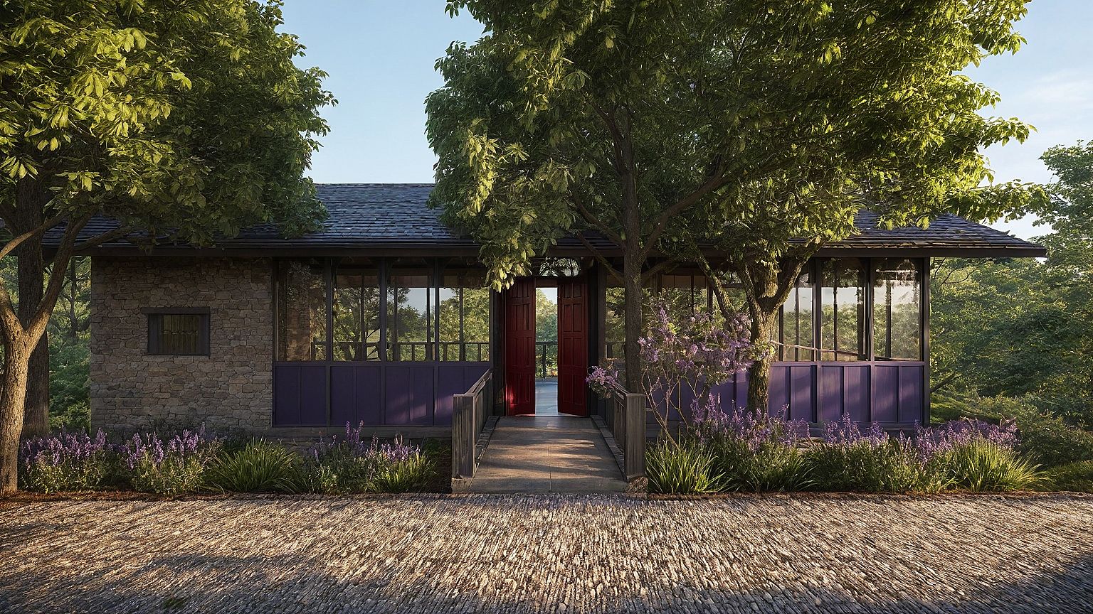 PromptRender this view as a crisp morning scene, capturing soft early sunlight filtering through the trees. The lighting should come from an eastern angle, casting long, golden shadows and giving a fresh, dewy atmosphere. Retain the vibrant purple flowers in full bloom and ensure they catch the morning light with slight highlights. The red doors should remain prominent—enhanced by a soft, warm glow to make them visually inviting. The stone façade should have slight morning dampness, subtly catching light without being too reflective. Add gentle sky tones with pale blue and hints of sunrise peach near the horizon. Include a feeling of freshness—such as soft leaf shadows, light mist in the background, or slight moisture on the pathway—to evoke a serene start to the day.