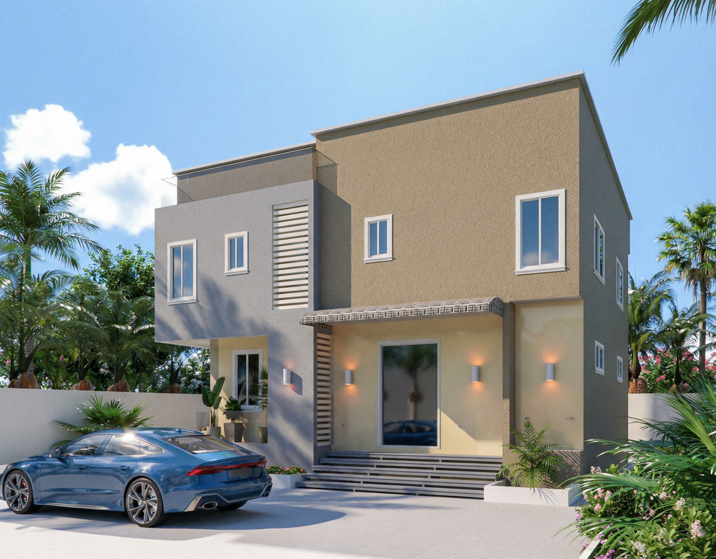 PromptPhoto of a contemporary two-story residential home, showcasing textured stucco exteriors in two contrasting colors. Architectural features include sleek vertical slats, large windows, and an inviting front porch with modern sconces. Surrounded by tropical landscaping and palm trees, the urban setting emphasizes a blend of nature and architecture. Captured in bright, natural daylight, the sunlight casts soft shadows, enhancing the building's details. Presented from a low angle to highlight its elevation, using a 35mm lens for a balanced perspective, creating a feeling of modern elegance in a serene environment., keep exact camera angle