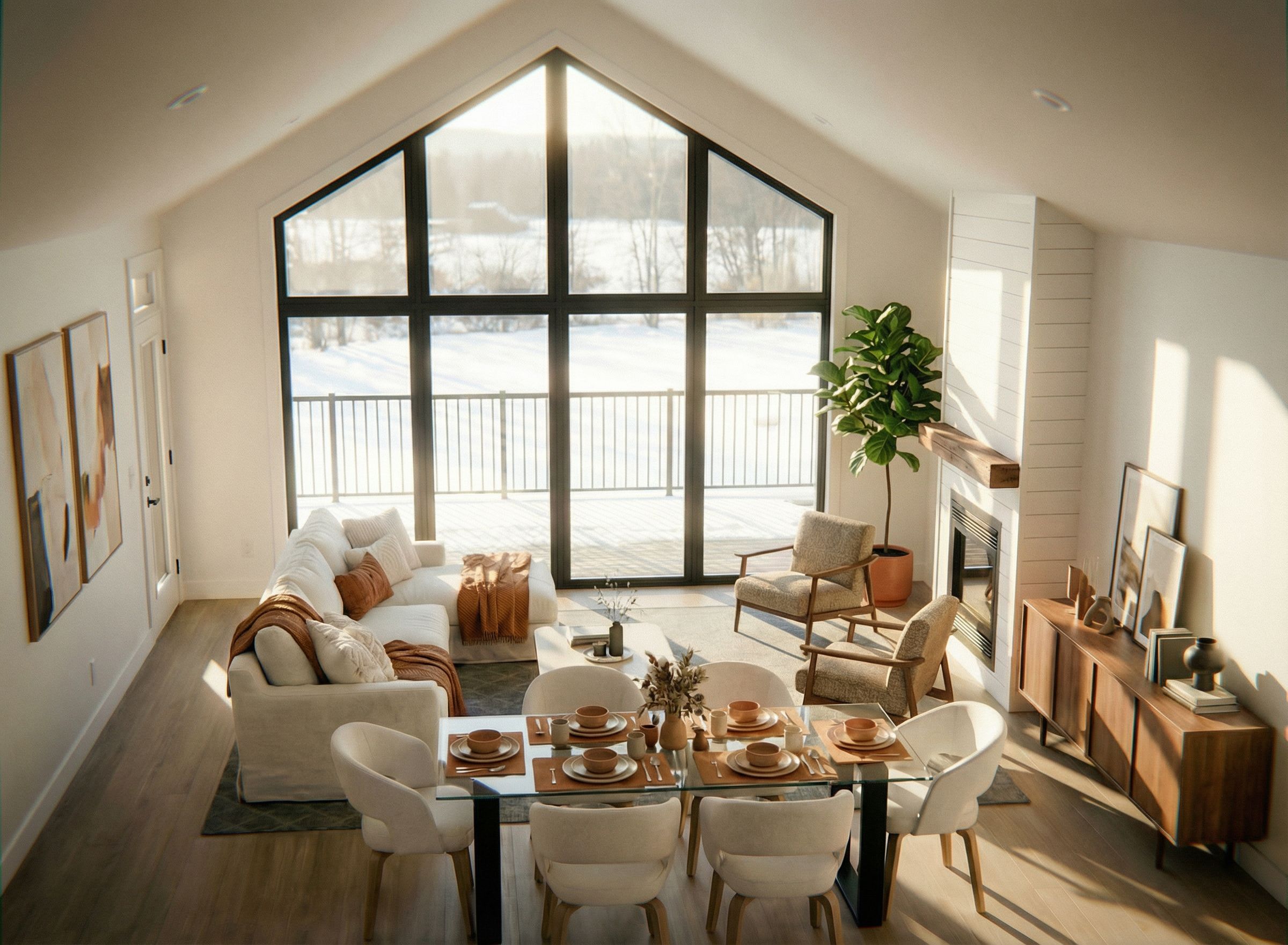 Promptadd warmth, decor, accent arm chairs, a indoor tree, replace the tv stand, no trim on the large windows in black, black large windows at rear, art work on rear wall, keep exact camera angle
