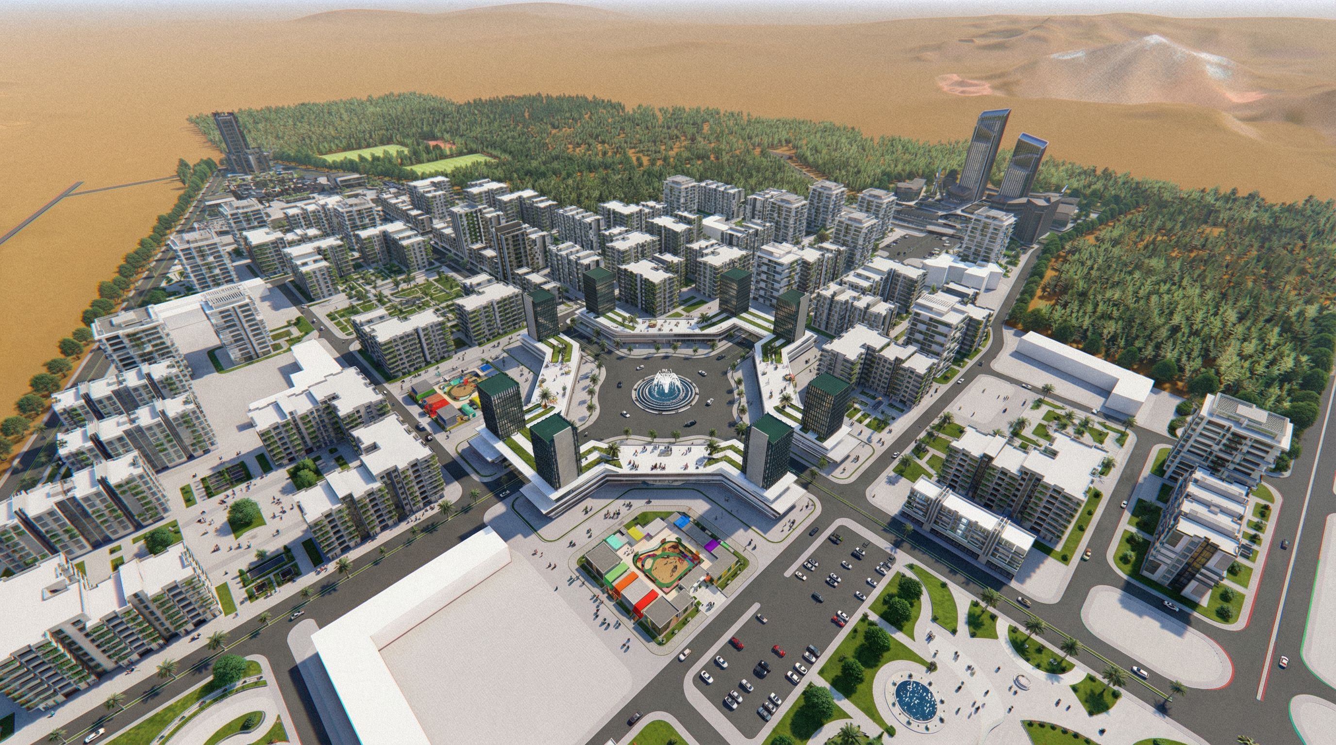 PromptPhoto of a modern urban residential complex featuring multiple mid-rise buildings with sleek facades and greenery integrated into the design. The layout includes landscaped courtyards and a central circular plaza with a decorative water feature. Set against a backdrop of dense trees and a desert landscape, the scene is illuminated by soft, natural daylight casting gentle shadows. Captured from an aerial perspective with a wide-angle lens, focusing on the geometric symmetry and vibrant colors of amenities below., keep exact camera angle