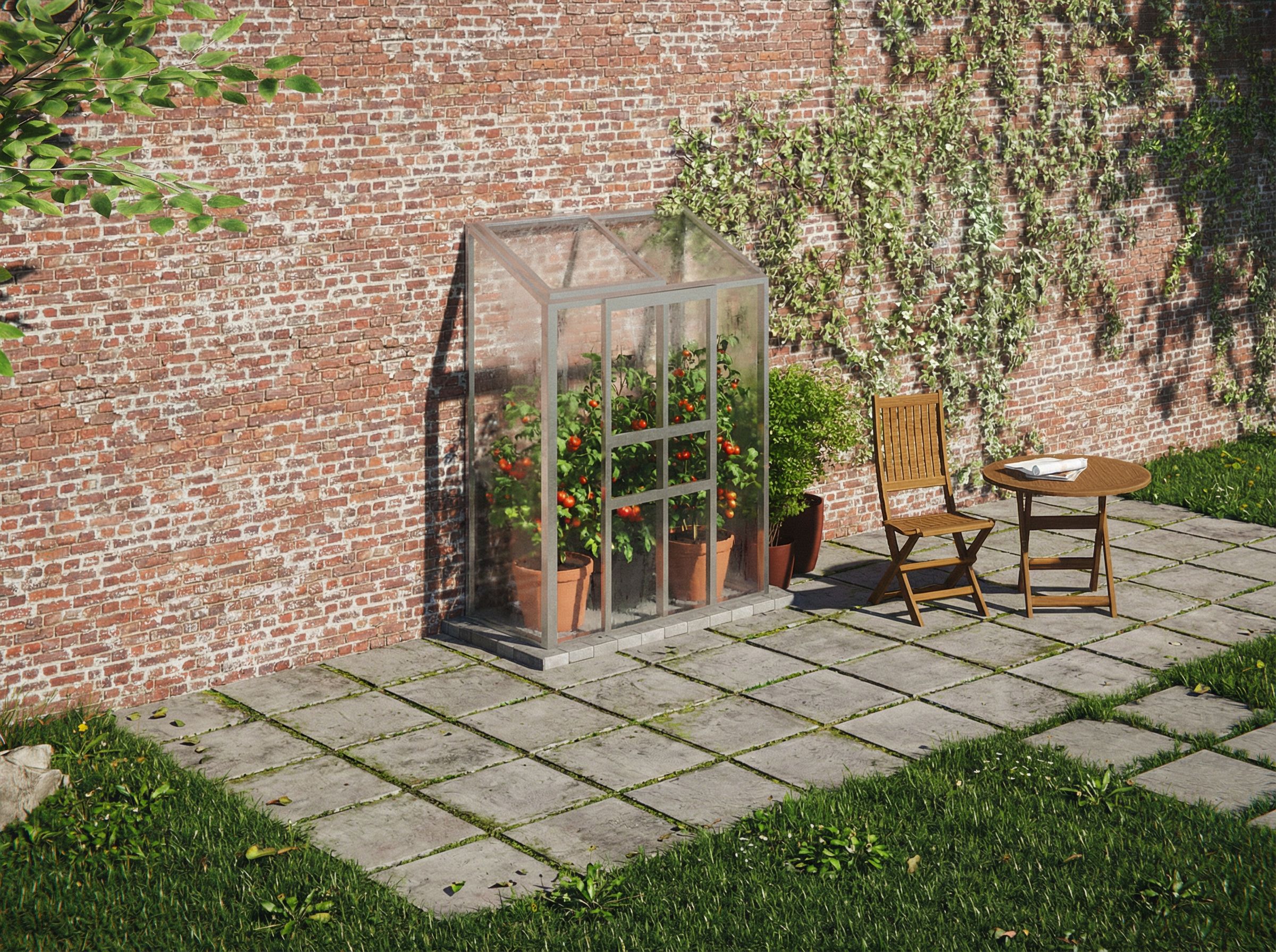 Can you optimize this visualization of a greenhouse so that it looks more realistic - both inside av the sorroundings? I would like to have a couple of terracotta pots with tomato plants inside the greenhouse - not too many. Optimize and makes the whole thing more realistic. , keep exact camera angle