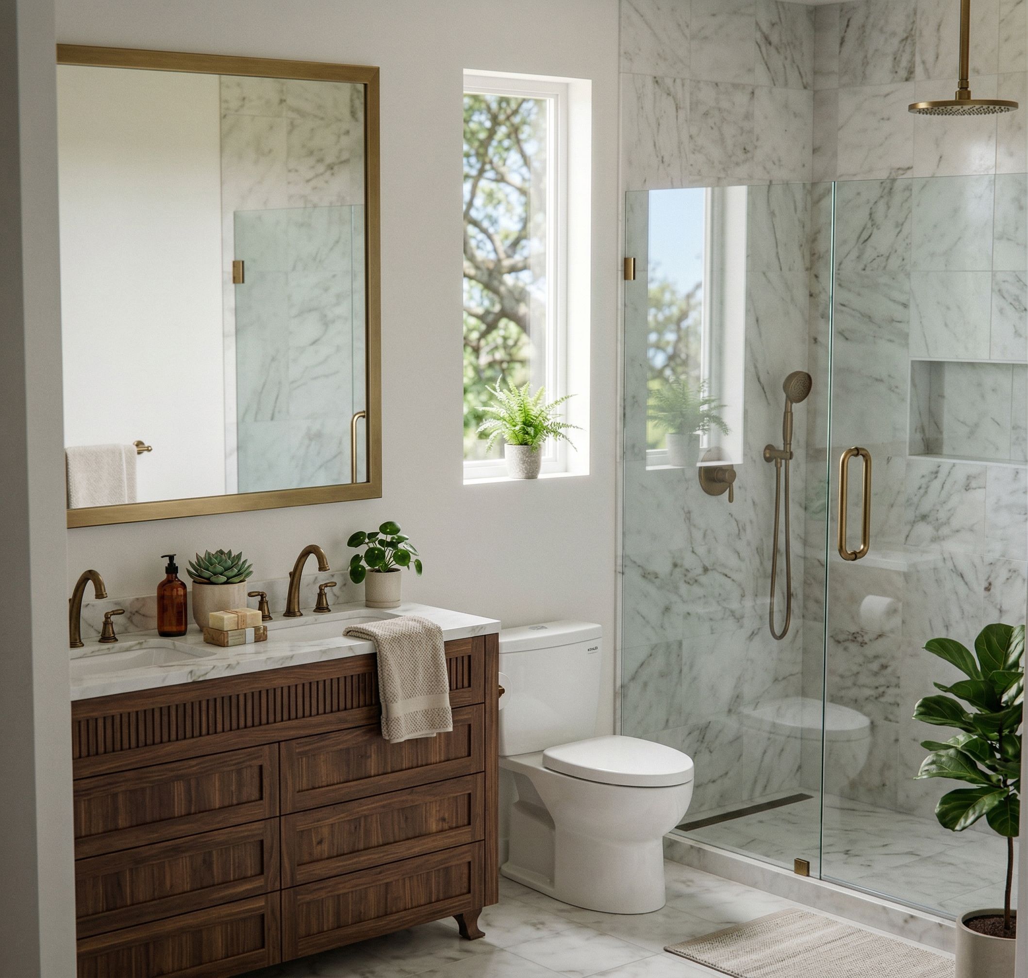 CLEAN MORDERN BATHROOM, CLEAR SHOWER DOORS, keep exact camera angle