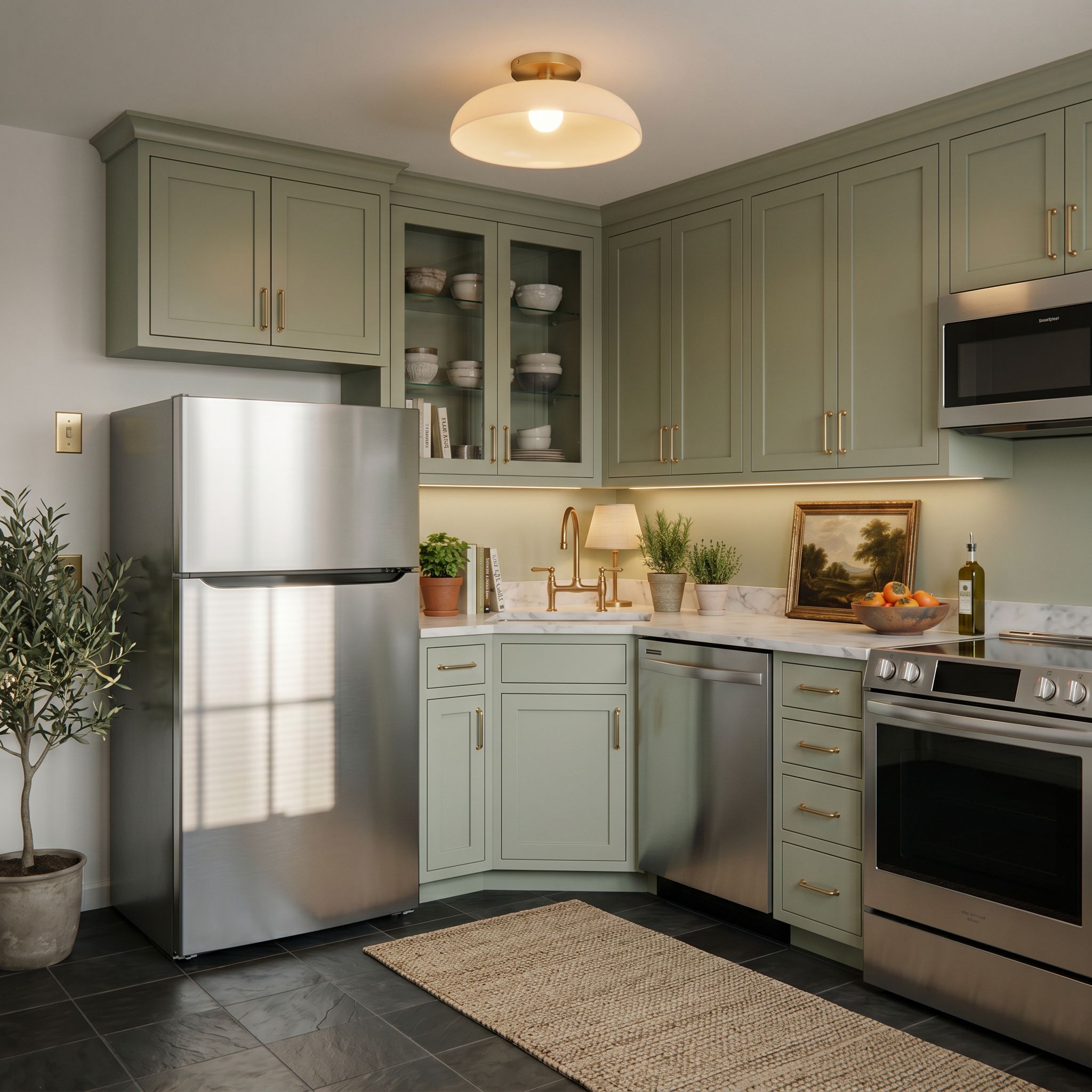 add a microwave above the range. move the artwork to be on the counter. add sisal runner on floor. Make backsplash same color as cabinets., keep exact camera angle