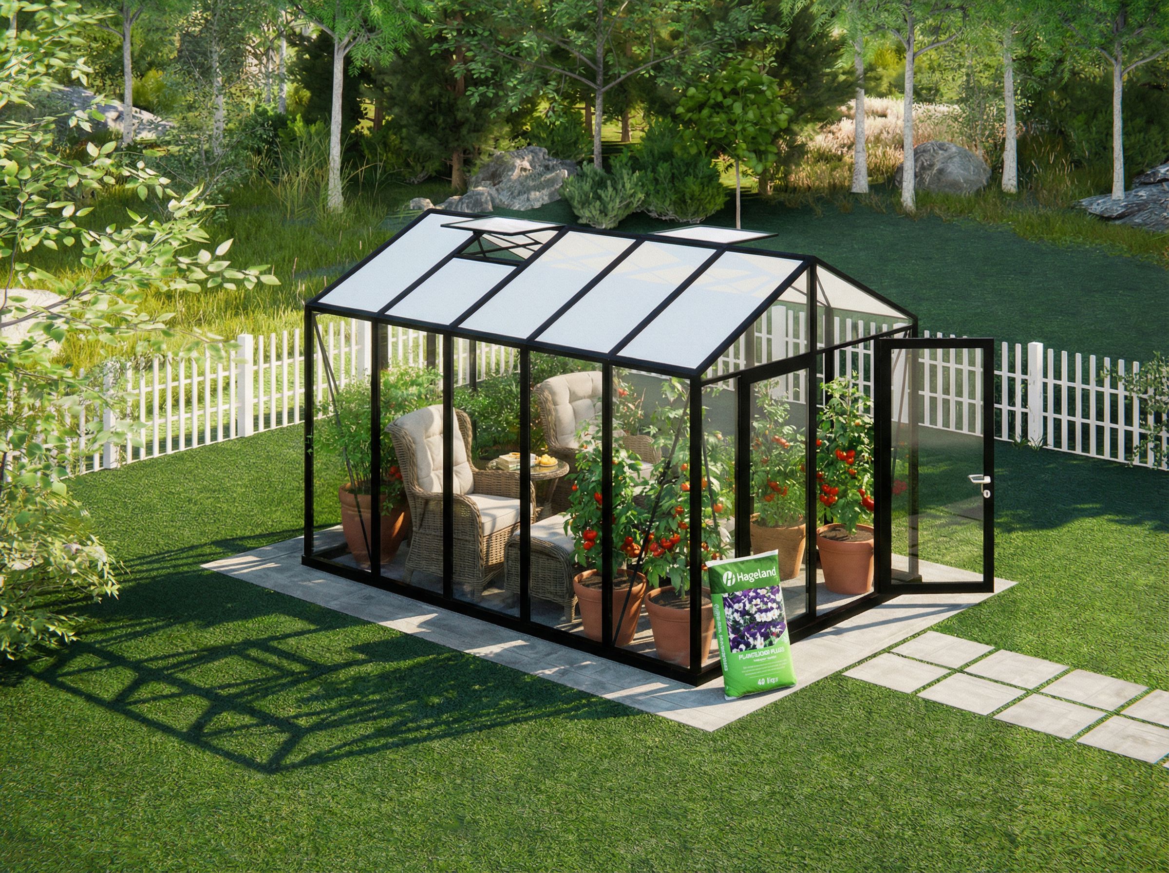 Make more realistic. Add furniture and dirt bag from reference. Keep roof glass slightly tinted white. Landscape format, not portrait. , keep exact camera angle