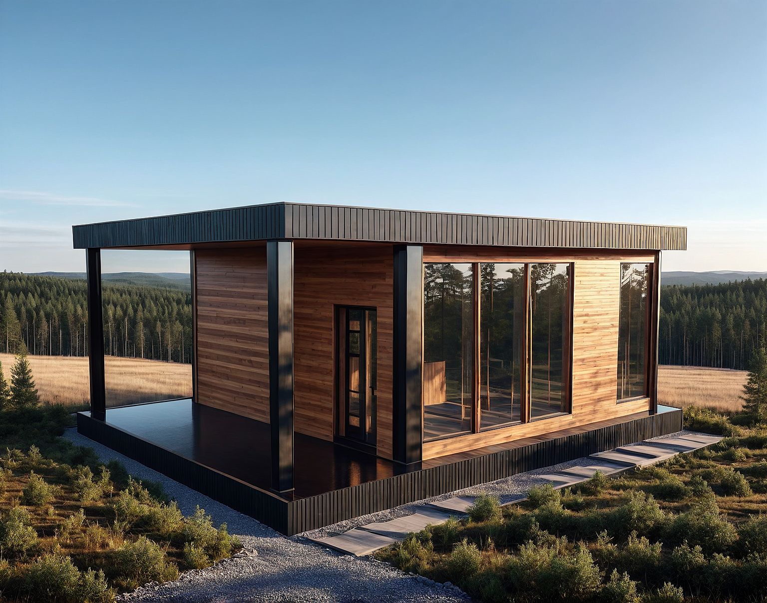 Modern minimalist house, wooden panels, glass windows, straight lines, geometric shapes, iron sheets and wooden planks, surrounded by forest.