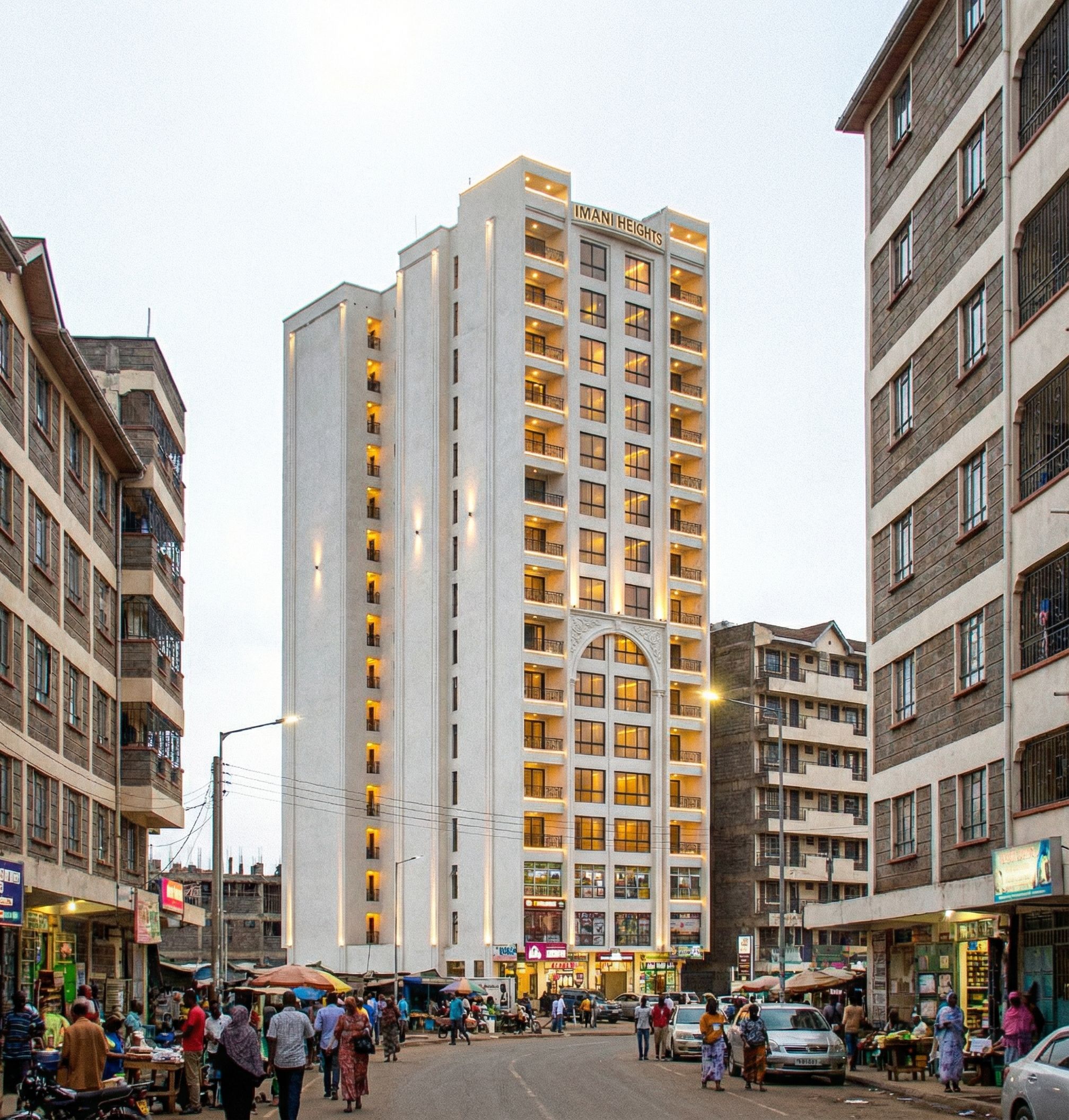 Perspective of a 15 storey building with ground and first floor as commercial spaces .Second to fifteenth floors as apartments. Turn on the lights in the building. Use spot lights and rope lights in the building and introduce street lights.Use white wall master on the building and introduce people of Somali and African origin on the street. Building located in Eastleigh area in Nairobi Kenya. Introduce graphics ' Imani Heights" on the building. SHOW WHOLE BUILDING. The road only passes in front of the shorter facade with arch . THE MAIN BUILDING SHOULD BE BETWEEN TWO OTHER BUILDINGS AND LET THE TWO BUILDINGS TOUCH IT.ROAD ON FRONT SIDE ONLY. INTRODUCE MOULDINGS ON BIG OPENINGS. BUILDING BETWEEN TWO BUILDINGS IN ONE LINE FACING THE SAME ROAD. AT MIDDAY. SHOW WHOLE BUILDING., keep exact camera angle