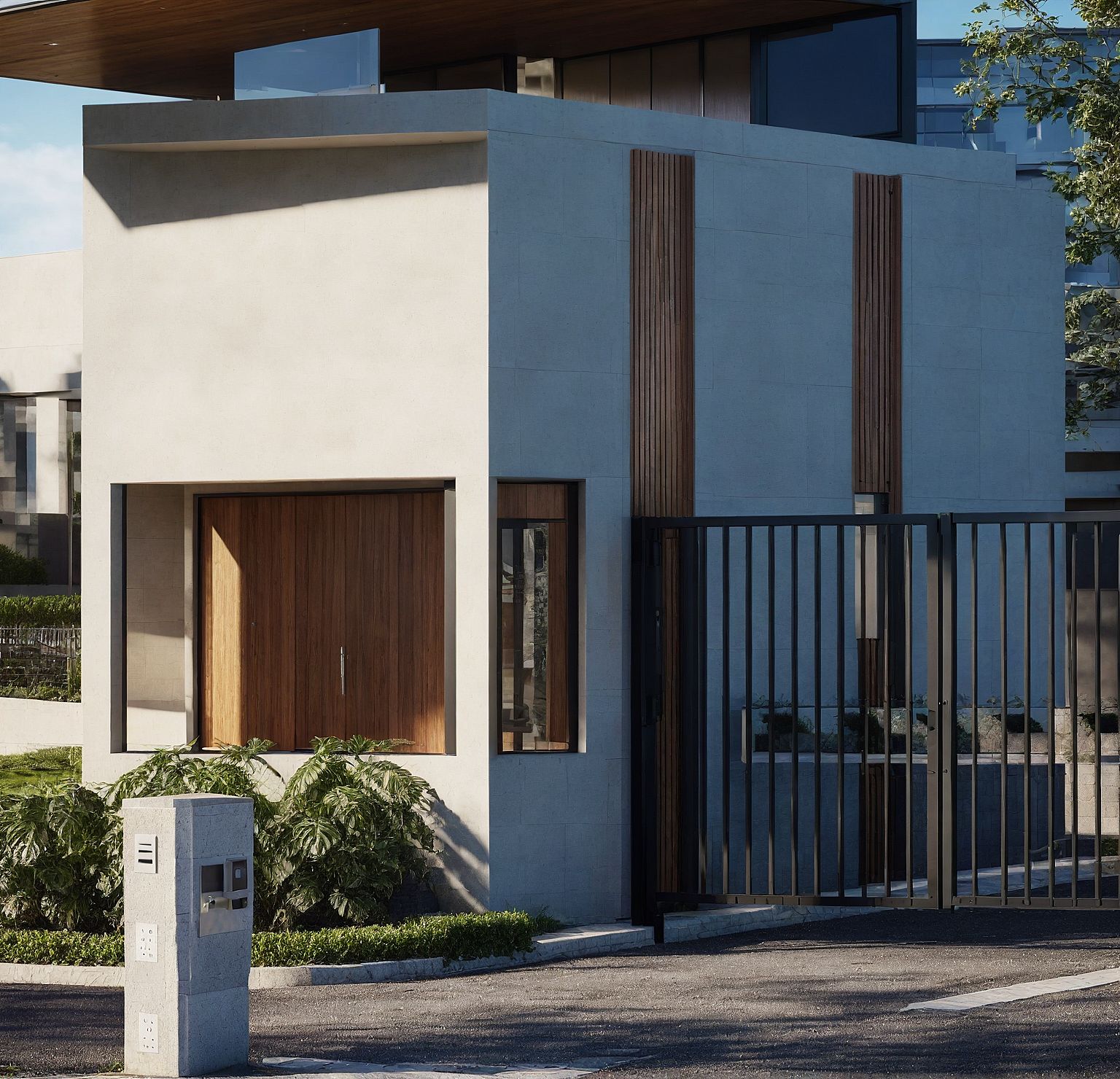 entrance gate to a housing estate. Keep the structural, geometry, the exact same textures and colors and architectural design of the image