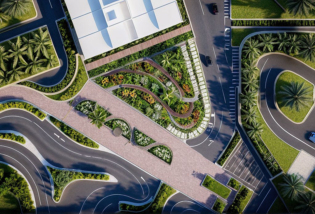 landscape of the ceramic museum, various types of tropical plants, landscape development, pathways, lights and plants on the ground, daytime render