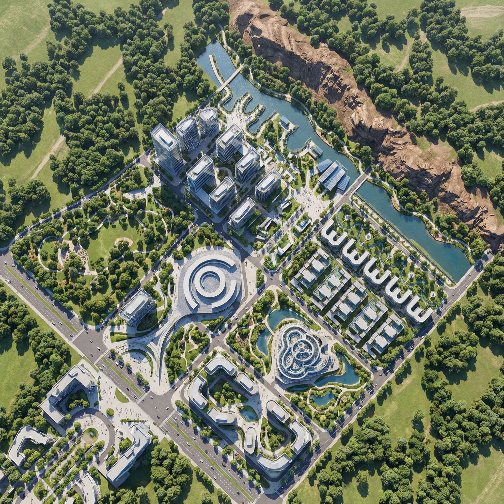 urban masterplan visualization, render this 3D mass into photorealistic rendering, Photo of a sprawling urban development plan featuring various building types, including circular and intricate designs. Emphasize modern architectural elements with sleek lines, glass facades, and unique organic shapes. Set amidst green landscaping with access roads and water features. Bright daylight casting defined shadows, highlighting textures of the materials. Bird's-eye view perspective with a wide-angle lens capturing the layout and surrounding environment, showcasing harmony between nature and design., aerial view from above, including people, vehicles, greenery and vegetation, pathways and walkways, high quality, professional, detailed scene