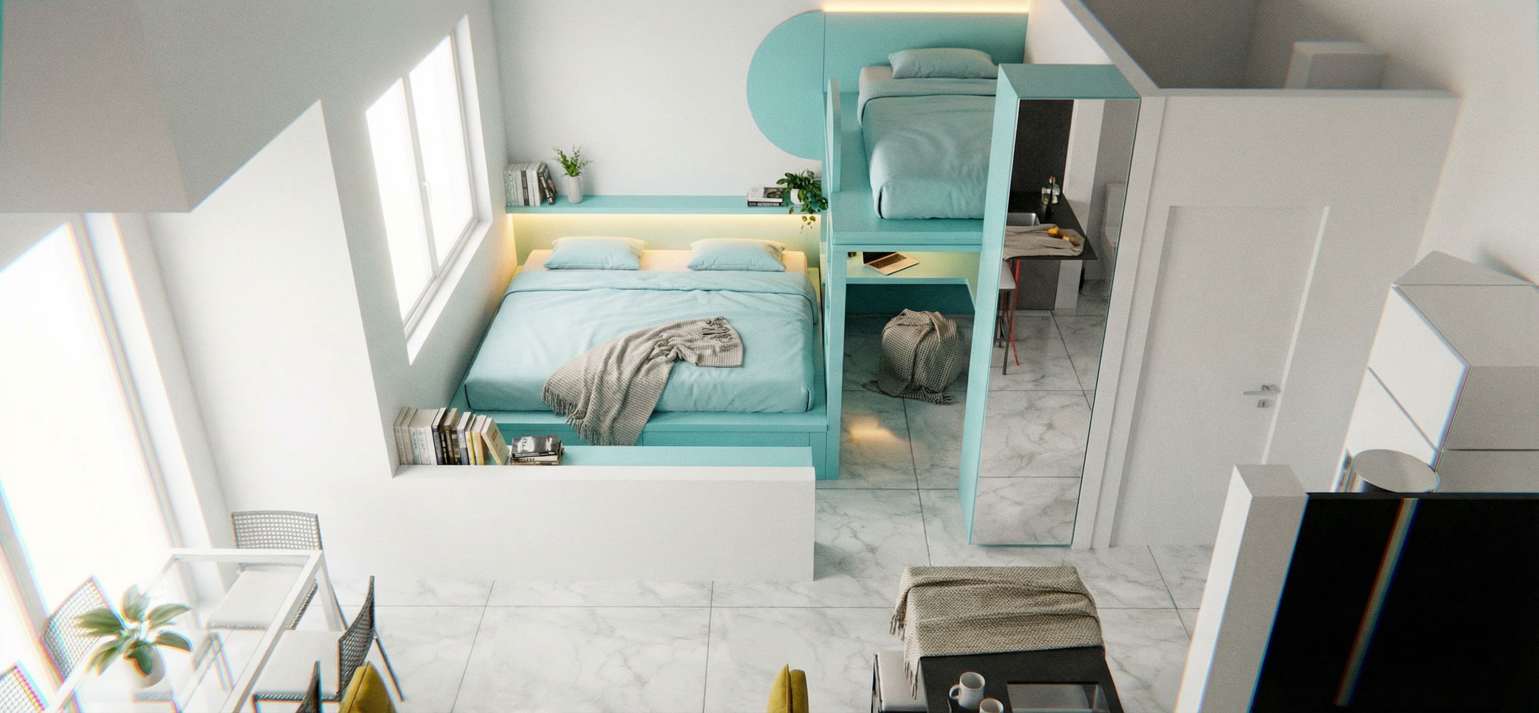 Light Blue Furniture Color All furniture currently in light blue must be replaced with the color: HEX #81D8D0 Modern satin matte finish. The phosphorescent green door panel visible from the living room must be mirrored mirror effect. Elegant reflective surface, not smoked, neutral mirror. Replace it with a full-height mirrored finish. Clean, contemporary mirror effect. Red Wall lower section Remove the red color. It must become pure white, matching all the partition walls of the apartment. LED Lighting Insert: Warm LED strip 3000K under the shelf above the bed. Integrated LED strip under the upper bed cabinets. Soft and diffused indirect lighting. Floor Keep the same existing tile. Slightly brighten the texture lighter, subtly whitewashed effect. Modern light marble look, natural finish. Overall Style Modern, minimal, bright. Soft natural light coming from the windows. Cozy yet elegant atmosphere. High-quality photorealistic rendering, global illumination enabled. All bed linens must be in a light Tiffany blue tone, slightly softer and brighter than HEX #81D8D0, with a smooth fabric texture and elegant appearance.