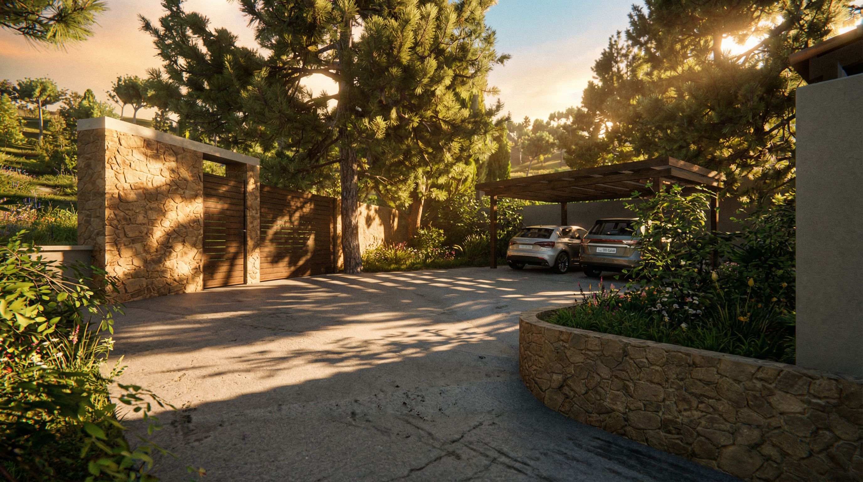 PromptPhoto of a modern residential property entrance, featuring a stone wall with wooden slatted gates. The design incorporates natural textures and earthy materials. Surrounded by lush greenery and tall pine trees, providing an inviting atmosphere. The driveway is concrete with a subtle gradient, leading to a carport sheltering vehicles. Soft sunlight filters through trees, casting playful shadows, suggesting late afternoon. Captured from a low angle perspective to enhance dimensionality, with a wide lens to encompass surrounding landscape and structure, highlighting the seamless integration of natural and built environments., keep exact camera angle