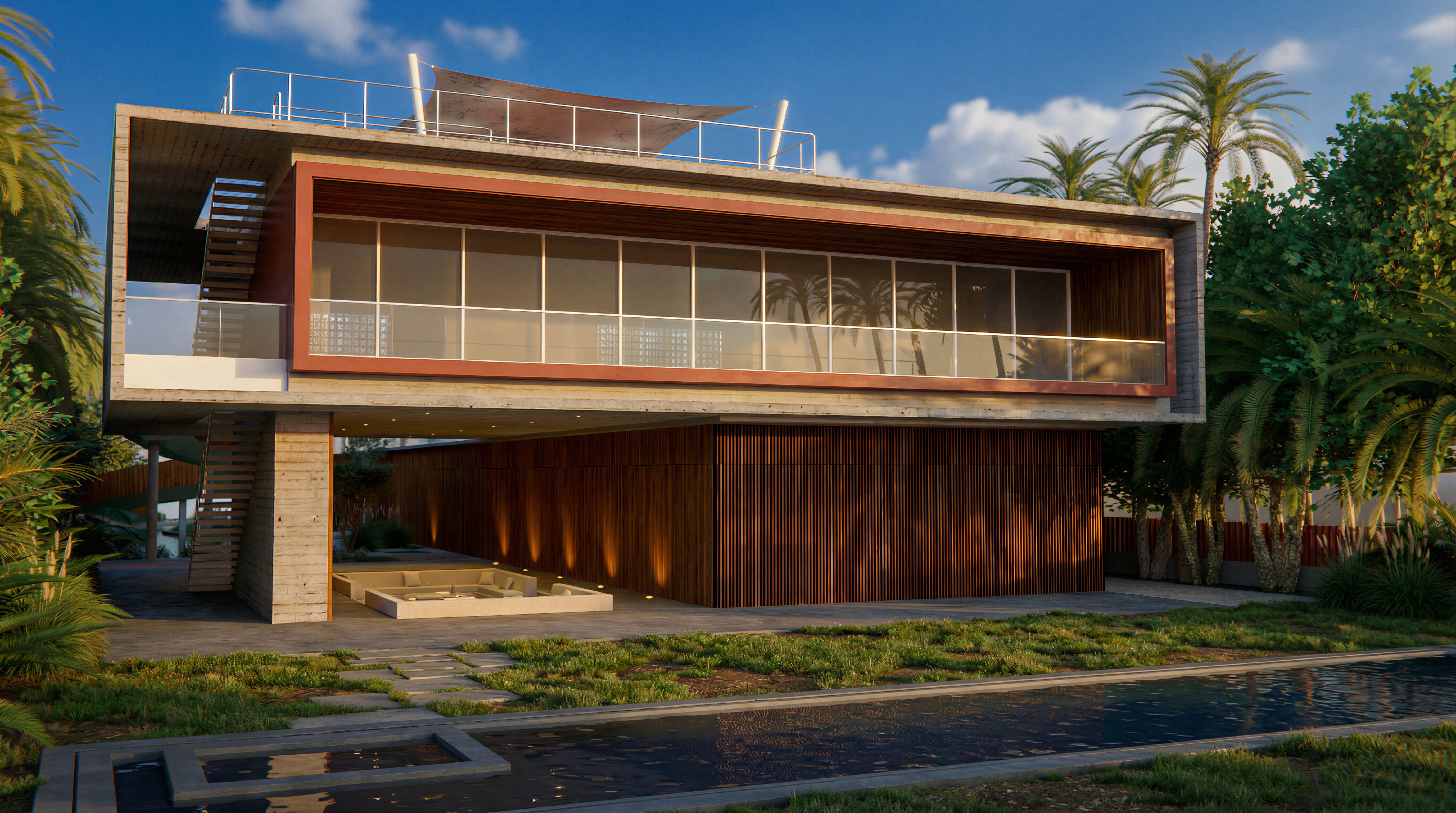 mejora el césped con pedazos menos uniformes, pon el suelo bajo la casa con cemento vibrado gris medio algo envejecido, los bordes de la piscina y su jacuzzi en gris oscuro, pon un cielo azul con pocas nubes blancas con una luz de media tarde la ora de oro en de primavera, pon la tela de los sillones más natural como con textura y que se vean los focos en el suelo en el porche de la entrada conserva el material de hormigón de las paredes y el toldo de la azotea, keep exact camera angle