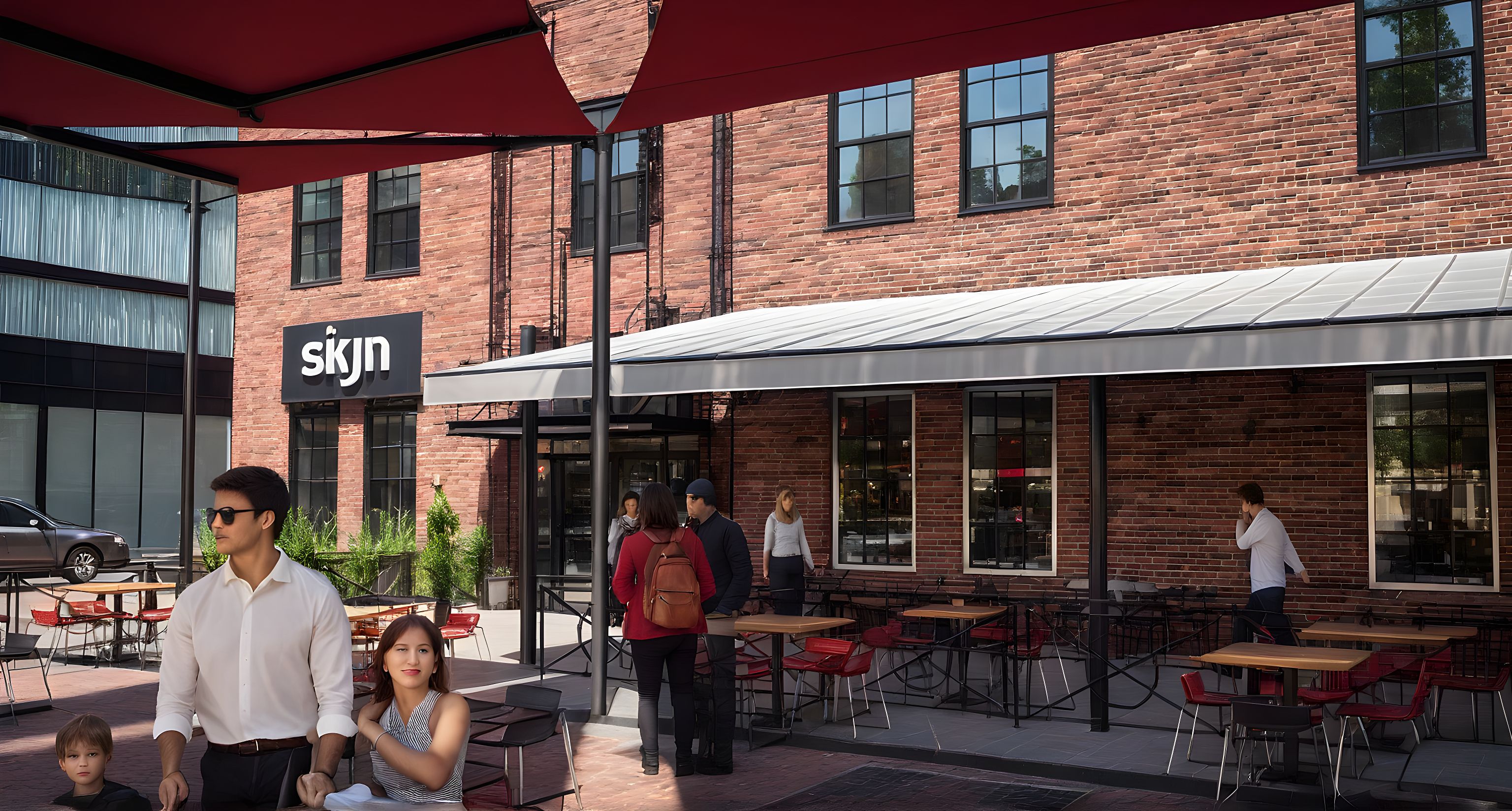 PromptPhoto of a contemporary urban café with a brick façade, featuring large windows and a metal awning. Highlight the textured red brick and the modern aluminum details. The café is situated in a bustling city square, surrounded by outdoor seating and greenery, with nearby buildings creating a vibrant atmosphere. Soft afternoon sunlight casts unique shadows across the pavement, enhanced by colorful fabric canopies overhead. Camera angle from slightly below eye level, using a 35mm lens to capture both the architectural details and the lively ambiance of the scene. Use real people