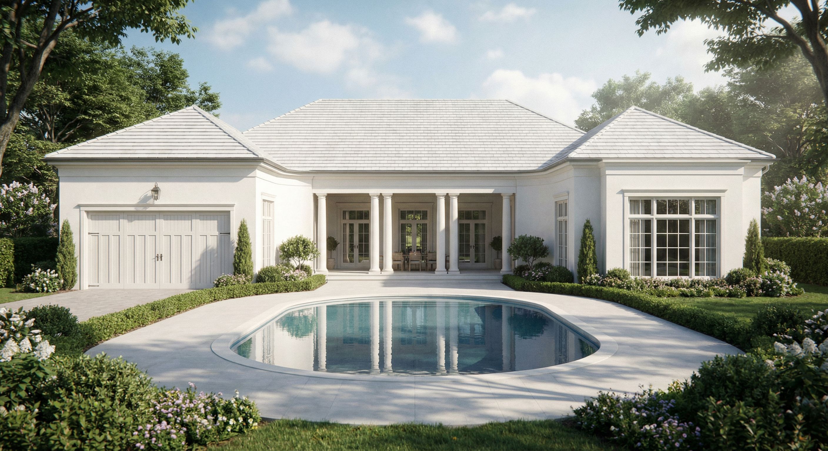 PromptUltra-photorealistic architectural exterior render of a Regency / Neo-Palladian style residence with strict symmetry and equal proportions throughout the massing. Facade is classically ordered, balanced, and restrained, emphasizing harmony and hierarchy rather than ornament. The rear facade is perfectly symmetrical and composed of three primary sections: a dominant central mass and two identical flanking wings. The flanking wings extend 8 feet forward from the face of the columns in the center loggia, maintaining equal proportions on both sides. the flanking sides total depth is 20ft. it forms a C shape and the depth should of the flanking wings should be noticeable. the wing on the left of the image is a garage. A covered loggia is centered on the rear elevation, projecting from the central mass and measuring approximately 12 feet deep. The loggia is classical and restrained, aligned with the building’s primary axis. The walls of the two flanking wings subtly concave inward toward the columns of the loggia, creating a gentle inward curvature that emphasizes the central axis while remaining symmetrical and refined. A centrally aligned oval pool is located directly off the loggia. it goes left to right to be in proportion to the house. the massing of the house should be as i describes. the depth should be noticeable with shadows. it should feel lively and not like a flat facade. Exterior material is smooth white stucco with subtle natural variation and realistic surface texture. Cast stone sills and headers are near-white, just slightly warmer than the stucco body, crisp and refined with clean profiles and delicate shadow lines. Windows feature only a header and sill—no full surrounds or casing Roof is a white-to-light-grey concrete tile, matte finish, clean and uniform with realistic scale and weight. Openings are perfectly aligned vertically and horizontally, maintaining a calm, even rhythm. Soft natural daylight with a slightly cinematic, dreamy atmosphere—gentle haze, softened highlights, and delicate contrast while maintaining photorealism. Realistic global illumination and true shadows. Camera at human eye level, straight-on elevation or very subtle perspective, show entirety of house. 40–45mm lens, professional architectural photography composition. Glass is clear with soft reflections and interior depth—never flat or overly glossy. Render quality comparable to high-end architectural photography, timeless, refined, and quietly cinematic. No stylization, keep exact camera angle