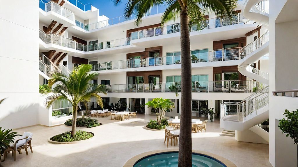 Photo of a modern multi-story building courtyard, LOCATED IN ARUBA featuring prominent, sweeping balconies and a central SINGLE pool area surrounded by greenery. Emphasize the sleek lines and white facade, with detailed railings and textured materials. The urban setting is enhanced by palm trees and outdoor seating, creating a serene atmosphere. Natural daylight casts soft shadows, highlighting architectural features. Capture a low-angle perspective with a wide lens to emphasize the building's height and the inviting communal spaces below, showcasing a harmonious blend of architecture and landscaping, ADD PEOPLE IN THE SCENE, REALISTIC RAILING