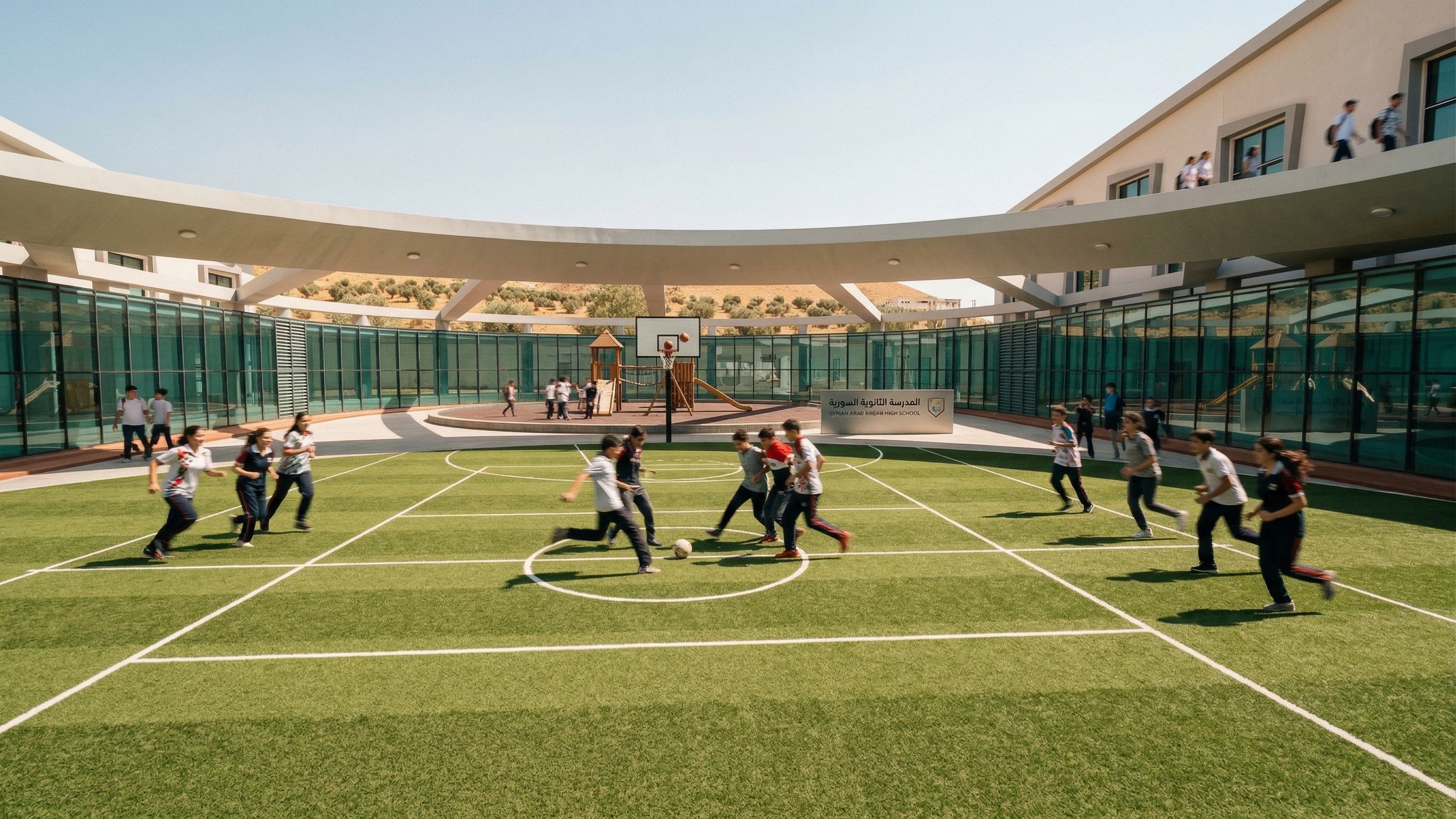 Promptit is the exterior 0f a modern Syrian ARAB high school and it shows the sport court and the playing area ..add students play football and run and enhance the materials and make it clean and well finished and make the scene super realistic.. the outside is a sport court where they play sports, keep exact camera angle, keep exact camera angle