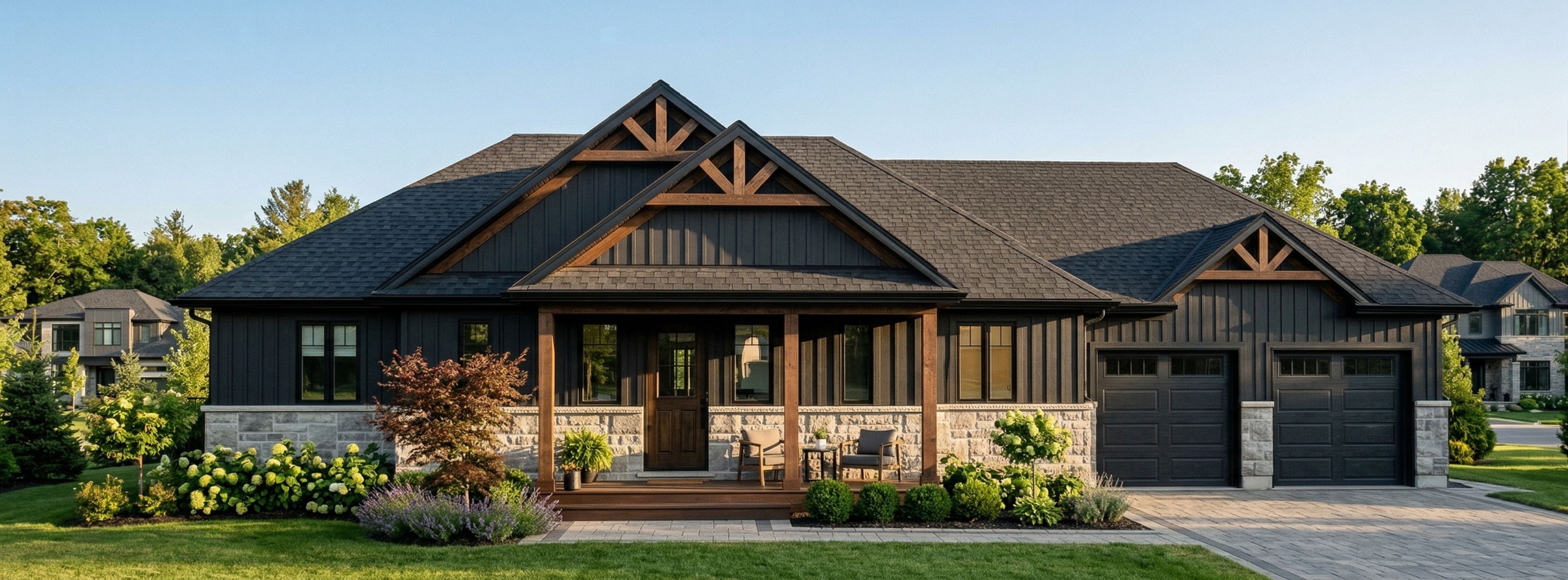Photo of a modern single-family home featuring a combination of dark wood and stone at the base. Highlight the intricate roof design with exposed beams, large windows for natural light, and a welcoming porch. Set in a serene suburban environment with lush greenery and other comparable homes nearby. Soft evening sunlight casts gentle shadows, enhancing textures on the facade. Perspective showcases a frontal view with a slight upward angle, emphasizing the roofline and architectural details, captured with a 35mm lens to create a balanced composition., keep exact camera angle