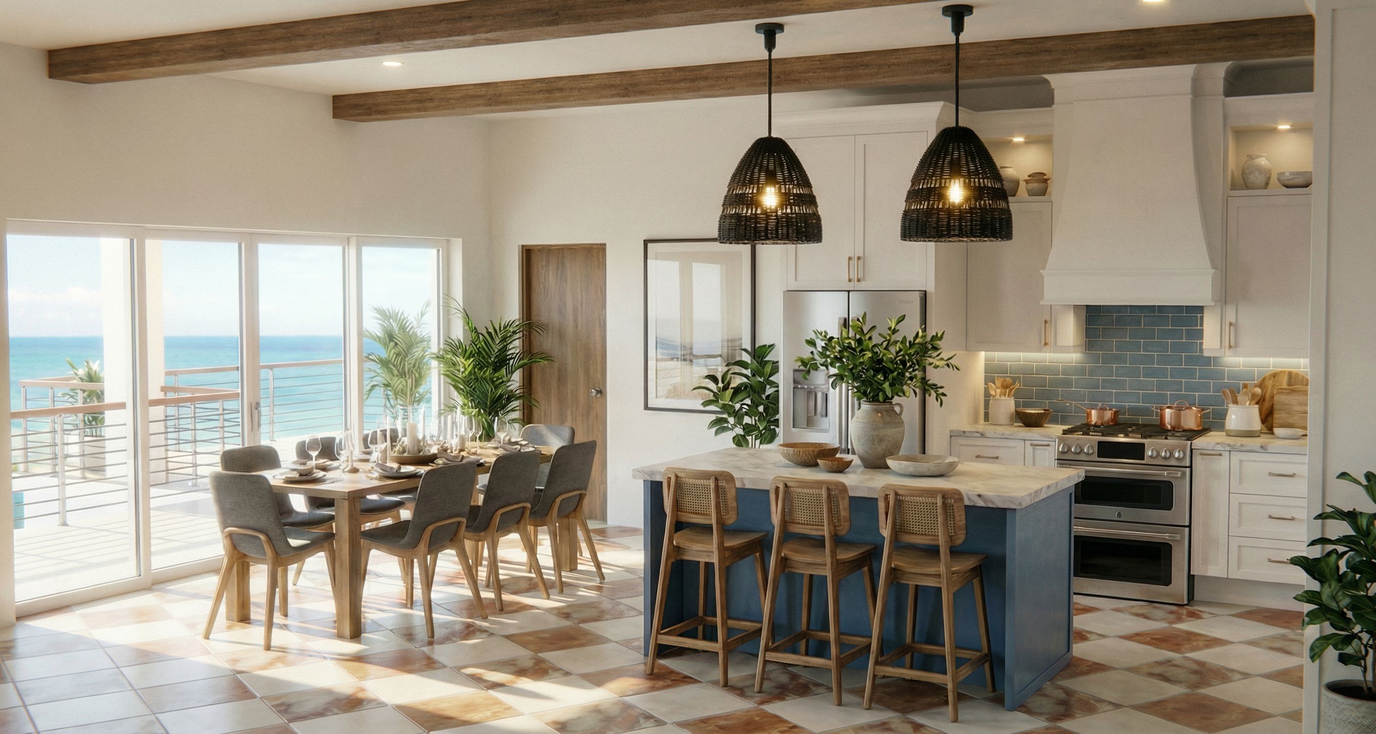 full sun, ocean view, luxury feel, way fancier, white and terracotta floor tiles, closed cabinets, blue subway tile, Mediterranean feel, can you take out the shelf above the cabinet doors, keep exact camera angle