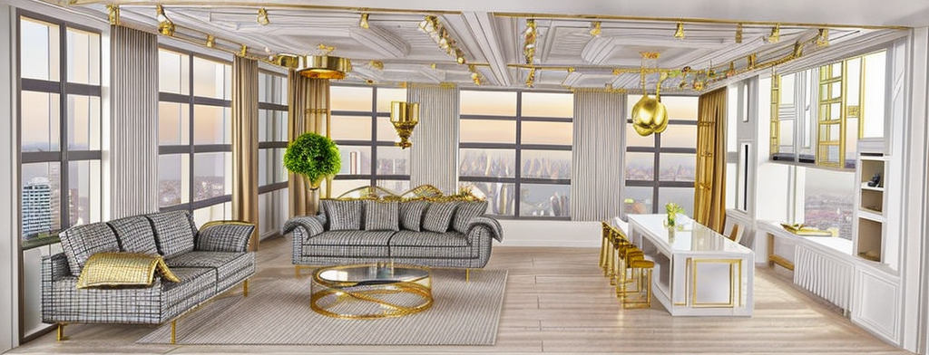 PromptPlease adjust the design to have a modern and elegant feel with neutral tones such as light gray, white, and beige. Reduce the use of gold to smaller accent details. The lighting should be soft and warm. Also, make sure the windows are open with a clear view of a natural landscape or city skyline visible through them. The outside background should be well-lit and natural to enhance the spacious feel of the room.