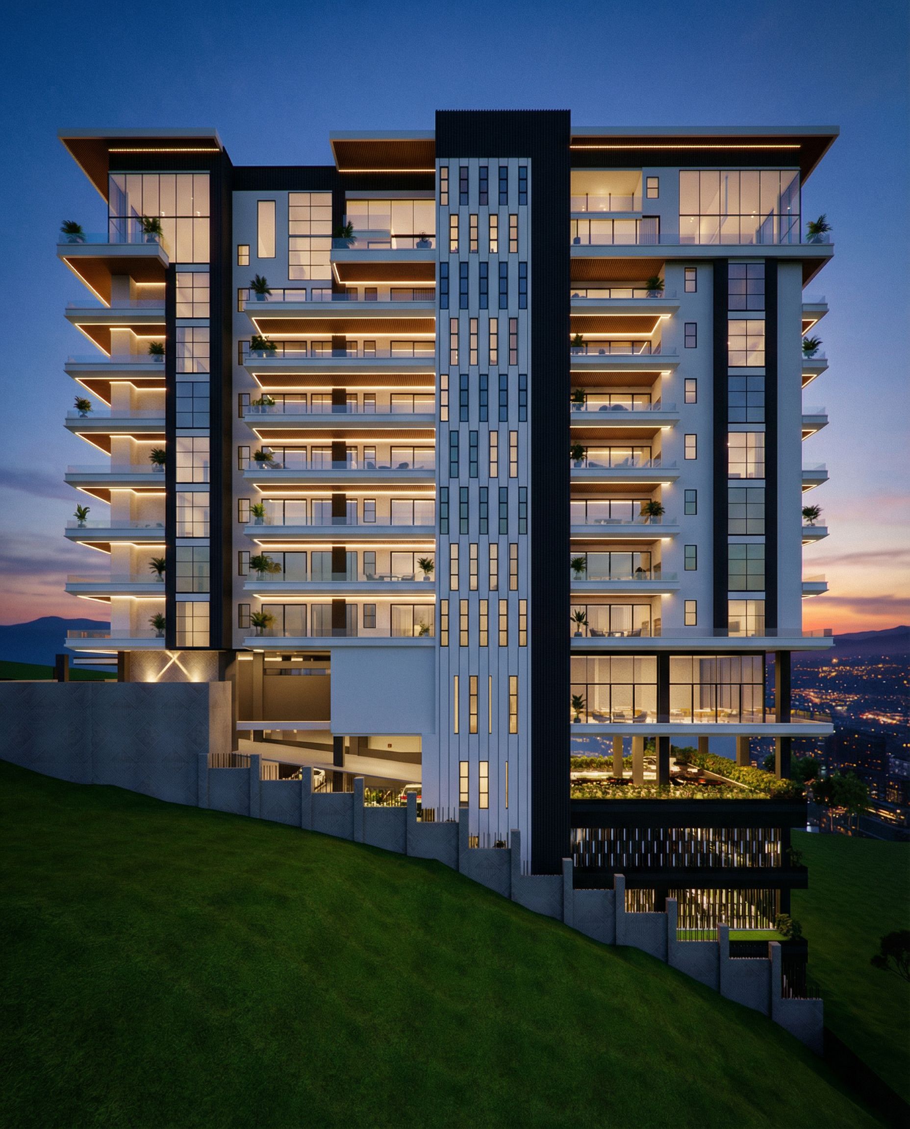 PromptPhoto of a modern residential high-rise building featuring sleek lines, large glass windows, and multiple balconies with wooden accents. Situated in an urban environment, surrounded by city lights and distant mountains. The image is set during twilight, casting warm artificial lighting and soft shadows on the facade. The camera captures a low angle perspective, focusing on the entrance and landscaping, using a wide-angle lens to emphasize the height and stylish architecture. add potted plants and seating on the balconies, keep exact camera angle