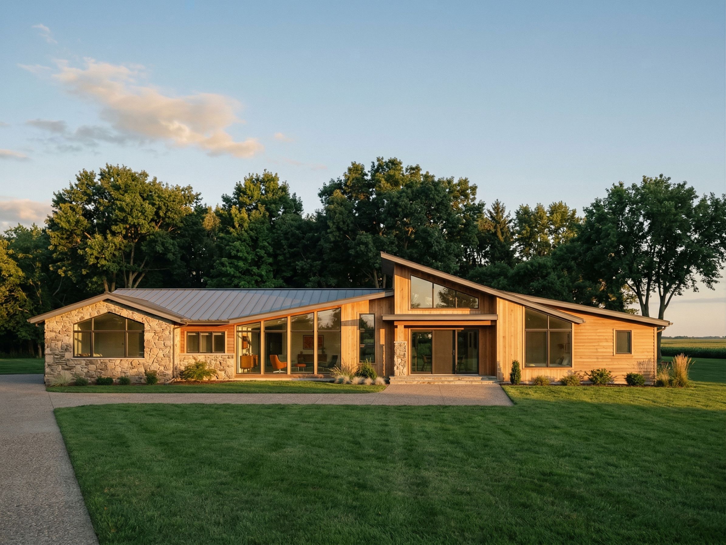 PromptPhoto of a mid century modern residence with a unique asymmetrical roof design, featuring large glass windows framed by natural stone and wooden accents. Surrounded by lush greenery, the structure harmonizes with its tranquil suburban environment. Natural sunlight bathes the facade during late afternoon, enhancing textures and creating soft shadows. Captured from a slight elevation with a wide-angle lens, emphasizing the integration of the home within its landscaped setting, showcasing both the architecture and surrounding flora., keep exact camera angle