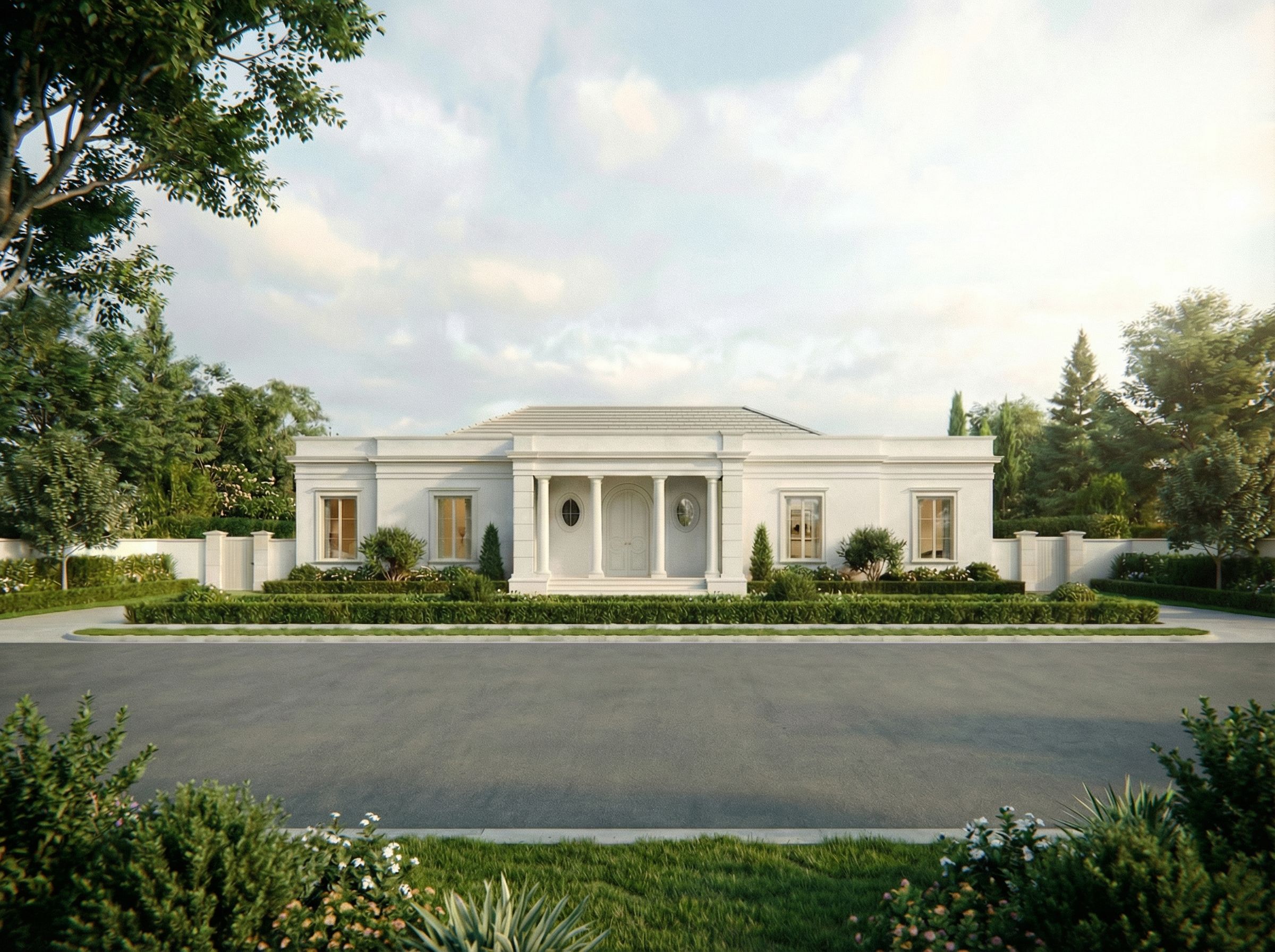 PromptThe facade wall terminates in a single, continuous horizontal sweep that forms the top edge of the wall and runs uninterrupted directly to the roof line. There are no stepped cornices, no secondary ledges, and no layered moldings. The sweep profile is extremely simple and shallow, reading as a clean wall cap rather than decorative trim. This instruction applies only to the wall sweep condition; all other architectural elements remain unchanged., keep exact camera angle
