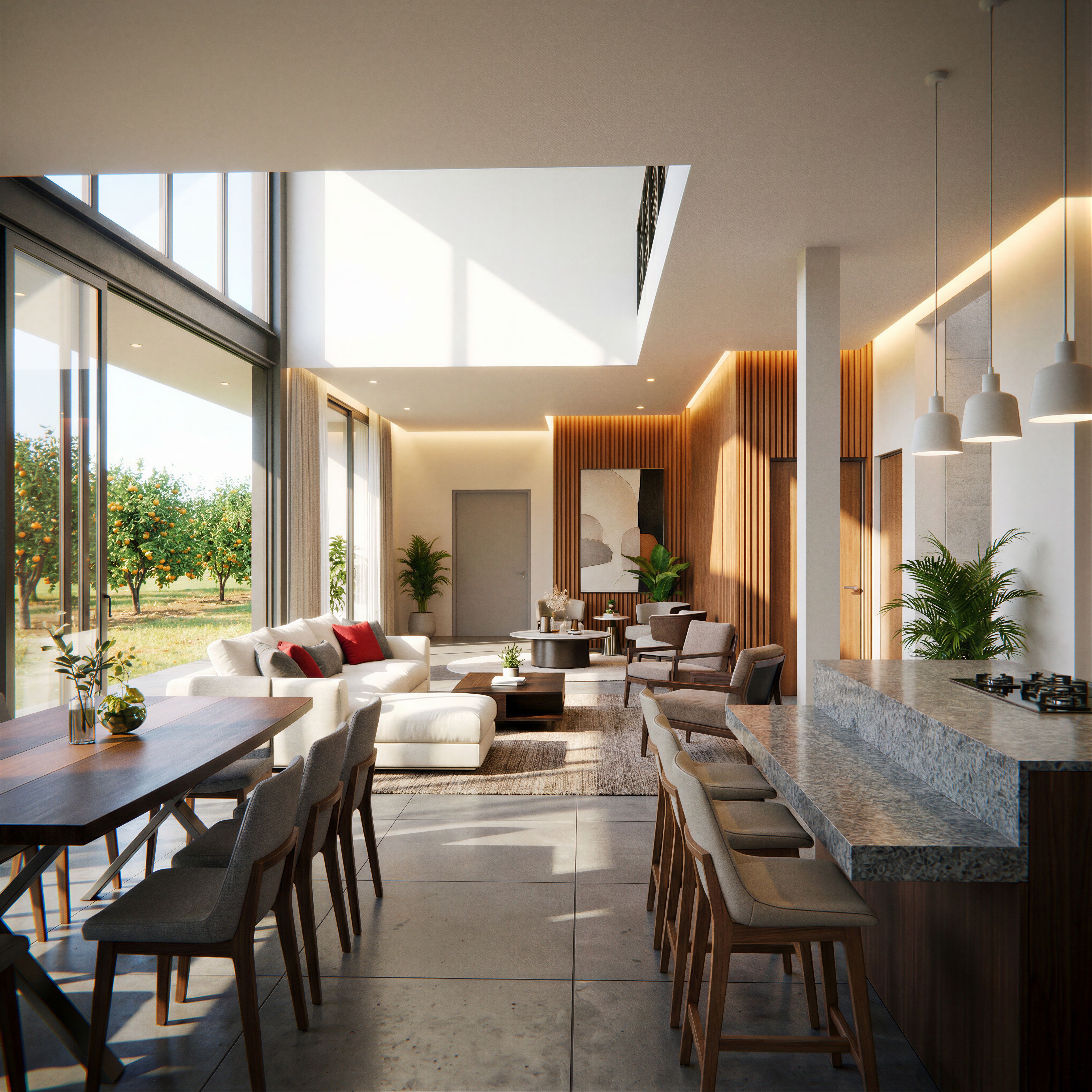 EnhancedPromptPhoto of a modern residence, with an open-plan living space featuring sleek lines and contemporary furniture. Highlight the warm wood cladding; in the foreground on the right is the open kitchen with an island bar topped with gray granite, and on the left, the dining area. In the double-height space is the living room, and in the background, some chairs and a coffee table serve as a foyer. The space features perimeter ceiling lighting and soft natural light, emphasizing the openness created by large windows and strategically placed skylights. The perspective is taken from an angle that captures the integration of the kitchen and living areas, using a wide-angle lens to accentuate depth and spaciousness. Include subtle reflections and shadows for increased realism. Outside, a field of fruit trees, respecting the design of the original photo.