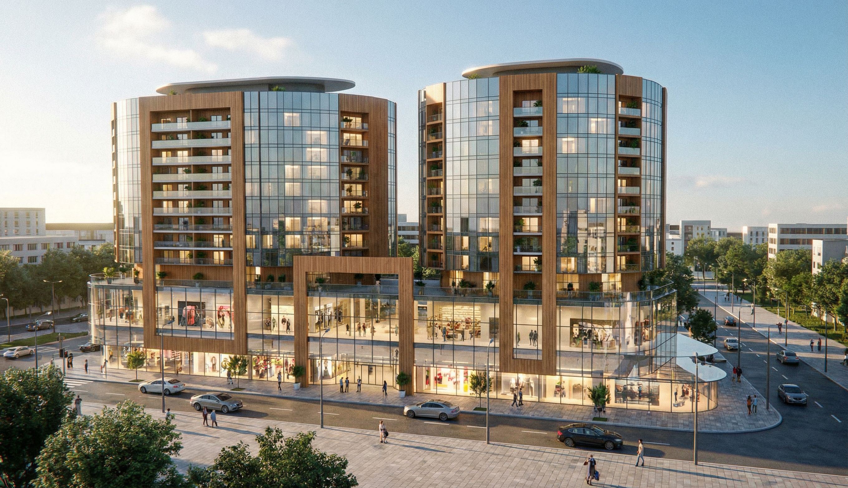THIS IS A TWO RESIDENTIAL BUILDINGS 10 STORIES ON A PODIUM WHICH IS A 4 STORIES MALL COMMERCIAL CENTER MAKE THIS BUILDING SUPER REAL AND ALIVE THE RESIDENTIAL TOWERS MUST LOOK ALIVE AND THE MALL MUST LOOK ICONIC THE TWO BUILDINGD MUST BE CLADDED WITH GLASS AND WOOD PANELS DON'T you ever Change THE SCALE OF THE BUILDING DON'T CHANGE THE CAMERA ANGLE OR THE FRAME OF IT DON'T CHANGE ARCHITECTURE MAKE THE MALL CLADDED IN GLASS CHOOSE MATERIALS THAT CAN MAKE THE BUILDING LOOK LIGHTER IN WHEIGHT KEEP THE CAMERA ANGLE FIXED KEEP THE SAME NUMBER OF STORIES 4 LEVELS FOR A MALL AND 10 FOR THE RESIDENTIAL THE ENTIRE BUILDING ESPECIALLY THE ROOF MUST BE APPEARD THE MALL MUST NOT SHOW THE ESCELATORS DON'T CHANGE THE CAMERA ANGLE keep exact camera angle ADD LIGHTS, keep exact camera angle