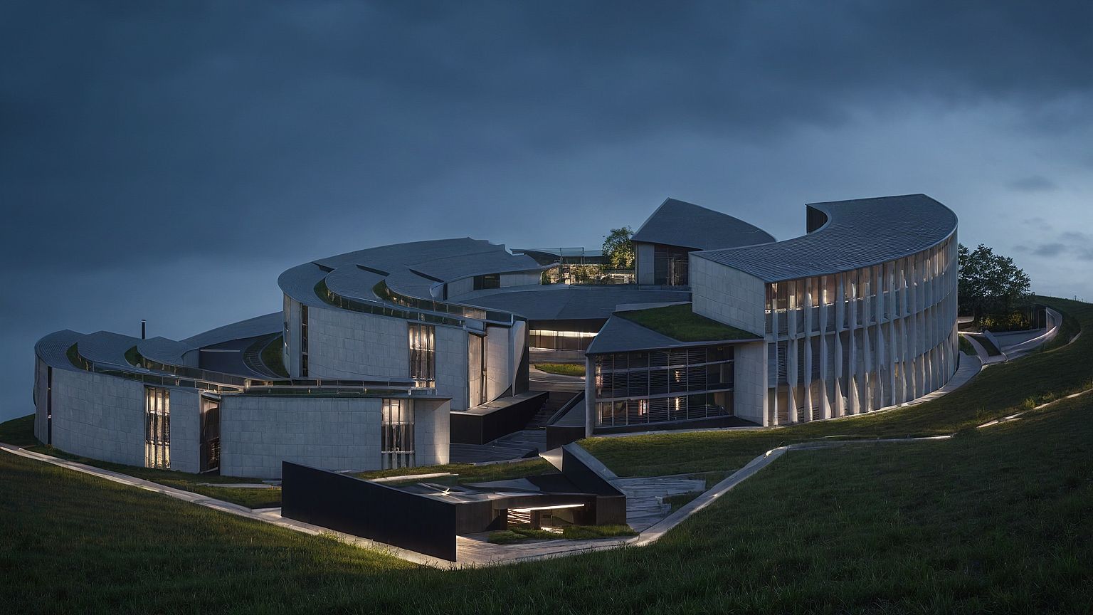 buildings with grey facades, grass roof, off white twisted louvers, pathing in Front of the building, night with lightind
