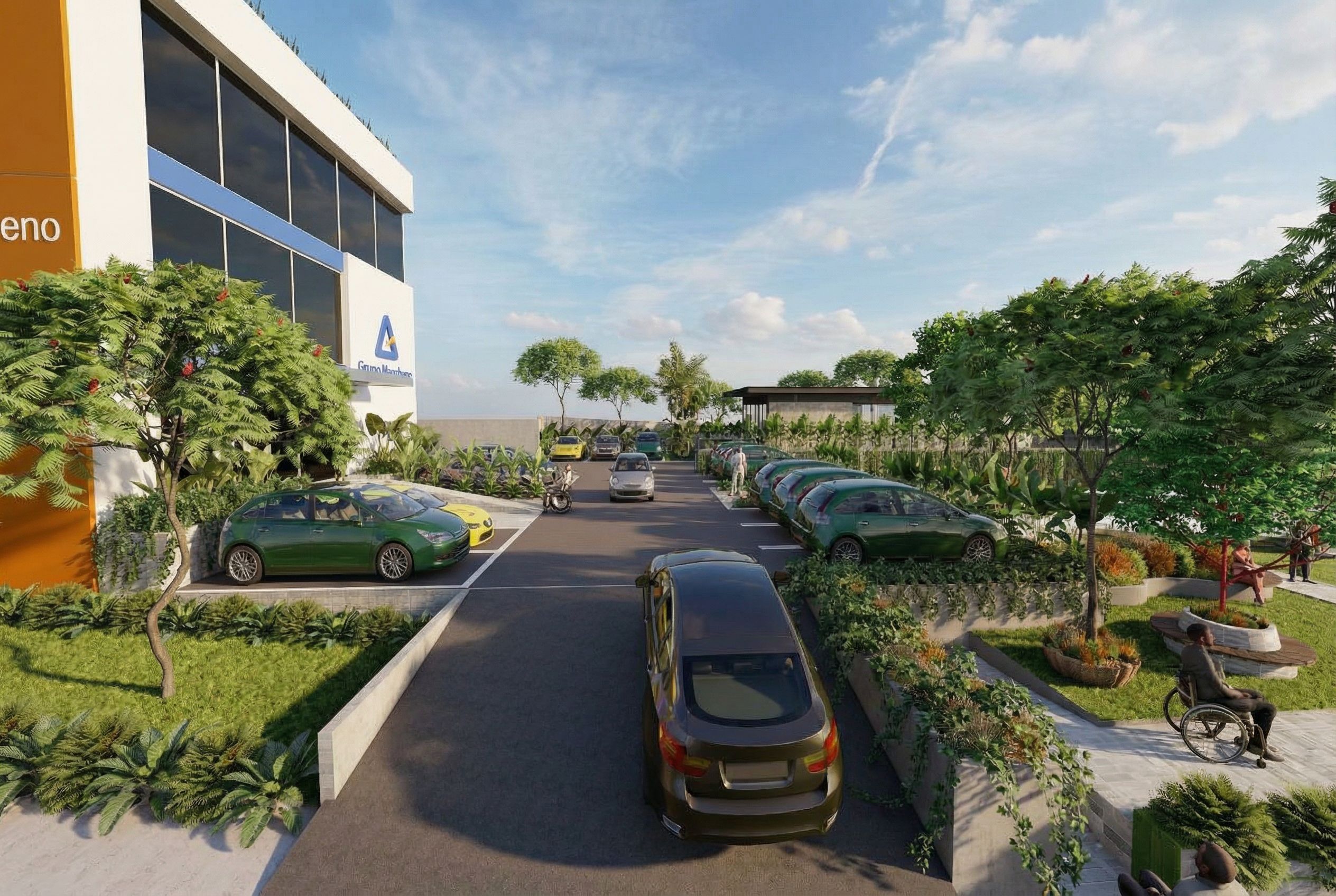 architectural exterior rendering, render this photo into photorealistic rendering, keep the original structure, forms and shapes and materials of the photo. And only improve lighting, shadows, and realism. , keep exact camera angle, including people, vehicles, greenery and vegetation, trees, high quality, professional, detailed scene