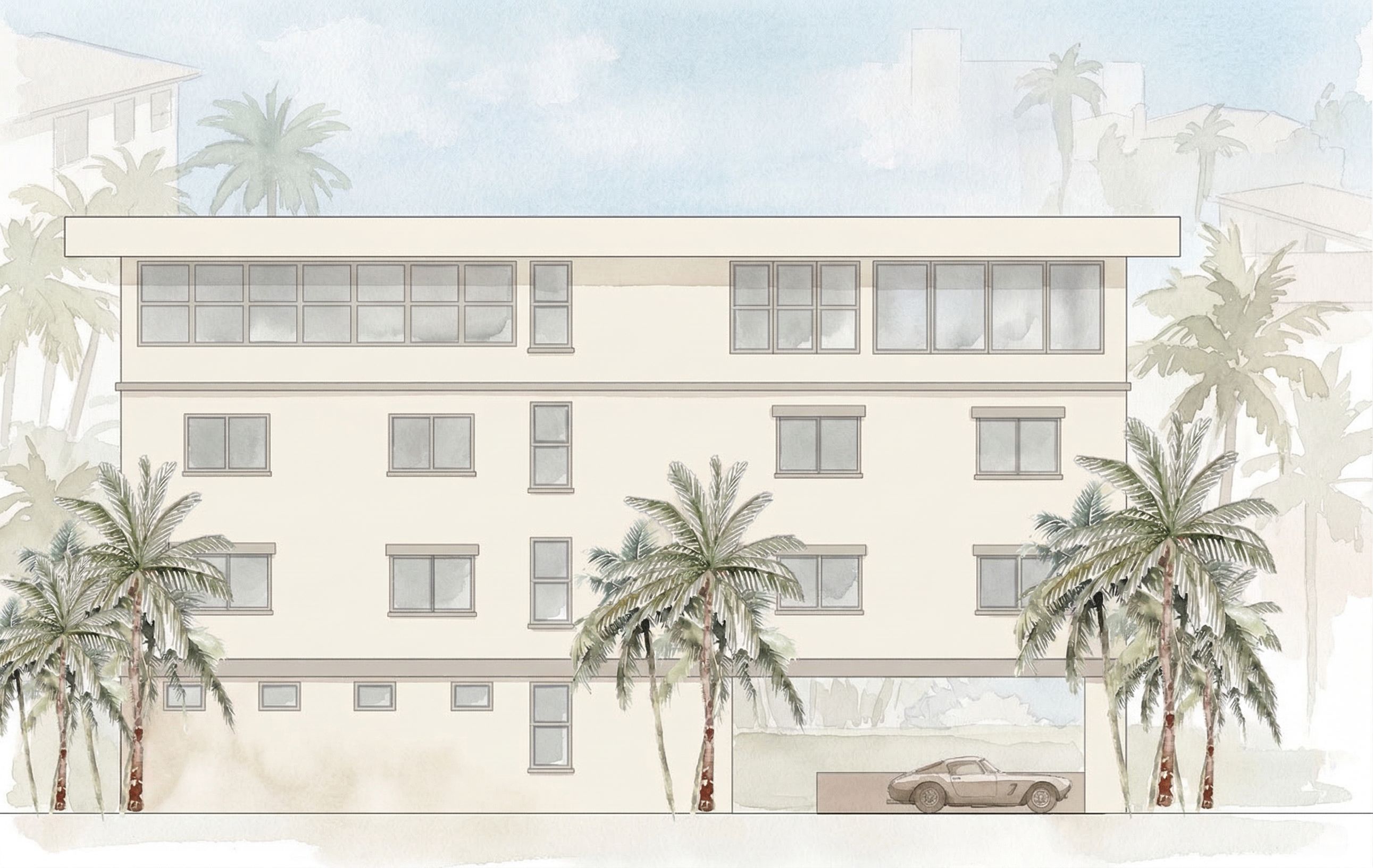 DO NOT change the architecture in any way. Do not alter proportions, windows, or layout. Do not add or remove elements. Do not crop the image. PROJECTION CONTROL STRICT — VERY IMPORTANT: Maintain a true orthographic elevation with ZERO perspective No depth, no vanishing points, no camera angle All horizontal lines must remain perfectly level All vertical lines must remain perfectly straight The roof must read as completely flat with no visible top surface Do not show any angled or perspective view of the roof or parapet STYLE: Soft watercolor architectural elevation Clean, crisp linework for the building Controlled, minimal shading Balanced between technical drawing and watercolor softness BUILDING KEEP VERY CLEAN: Main stucco: warm creamy white HEX #EFE7DA Subtle tonal variation only no heavy shadows or gradients Windows: soft gray HEX #B8B6B0, minimal reflection Trim: muted taupe HEX #C8C1B6 Maintain sharp, readable edges BACKGROUND FULL RESET — IMPORTANT: Completely replace the existing background with a new watercolor environment Do NOT blend or reuse the original background image Create a soft, simplified Palm Beach setting with: • loose watercolor palm trees • light, abstracted building silhouettes • minimal detail and soft edges Background should be lighter, desaturated, and slightly faded Ensure it does not compete with the building SKY: Soft watercolor wash HEX #D6E6F2 Gentle tonal variation and subtle cloud texture Organic edges, not a flat fill GROUND: Maintain a clean, straight horizontal ground line at the base Light watercolor wash below the line Soft fade into paper below, but keep the building grounded CARS: Simple watercolor-style vehicles Minimal detail, soft edges Neutral tones avoid bright saturated colors MOOD: Calm, elegant, and refined Clean presentation suitable for client approval IMPORTANT: The building must remain the sharpest and most defined element Background must be newly generated and cohesive The final image should read as a clean architectural elevation, not a perspective rendering, keep exact camera angle