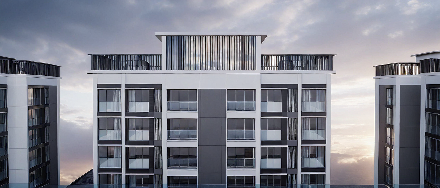 Prompt"Generate a 3D render of a sleek and modern residential highrise. The building should feature a sophisticated grey and white color combination, with large glass windows that provide ample natural light.