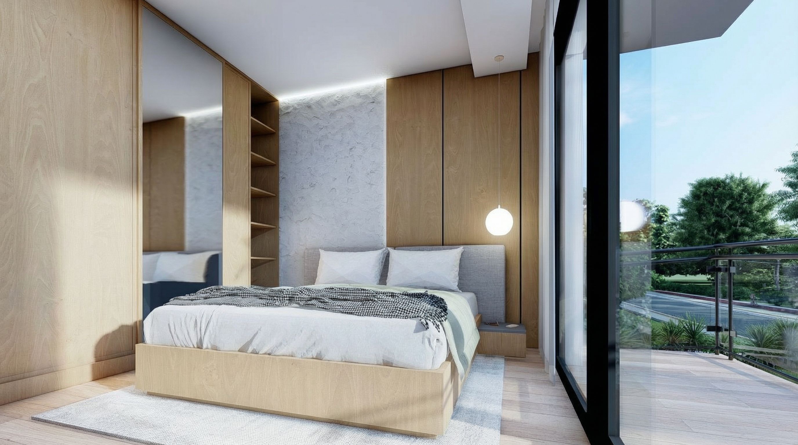 interior design rendering, render this 3D mass into photorealistic rendering, “Enhance this interior render of a modern villa while preserving ALL original materials, textures, colors, finishes, furniture, lighting fixtures, layout, geometry, and proportions exactly as they are. Do NOT alter or replace any material or object. Maintain the exact same camera angle, framing, and perspective, but output the final image in a wide landscape format, not portrait. Ensure the orientation remains horizontal and cinematic, avoiding any phone-style vertical crop. Adjust the overall tone and lighting to be cooler, reducing warm color temperatures. Introduce soft cool daylight, bluish-neutral highlights, and balanced global illumination while maintaining realistic lighting. Sharpen details for clean, crisp architectural lines, enhance texture clarity, refine shadows, and improve reflective accuracy without changing the design. Final output: ultra-clean 8K high-resolution landscape render, photorealistic, no distortion, no noise, no added or removed elements., keep exact camera angle, bright daylight, natural lighting, high quality, professional, detailed scene