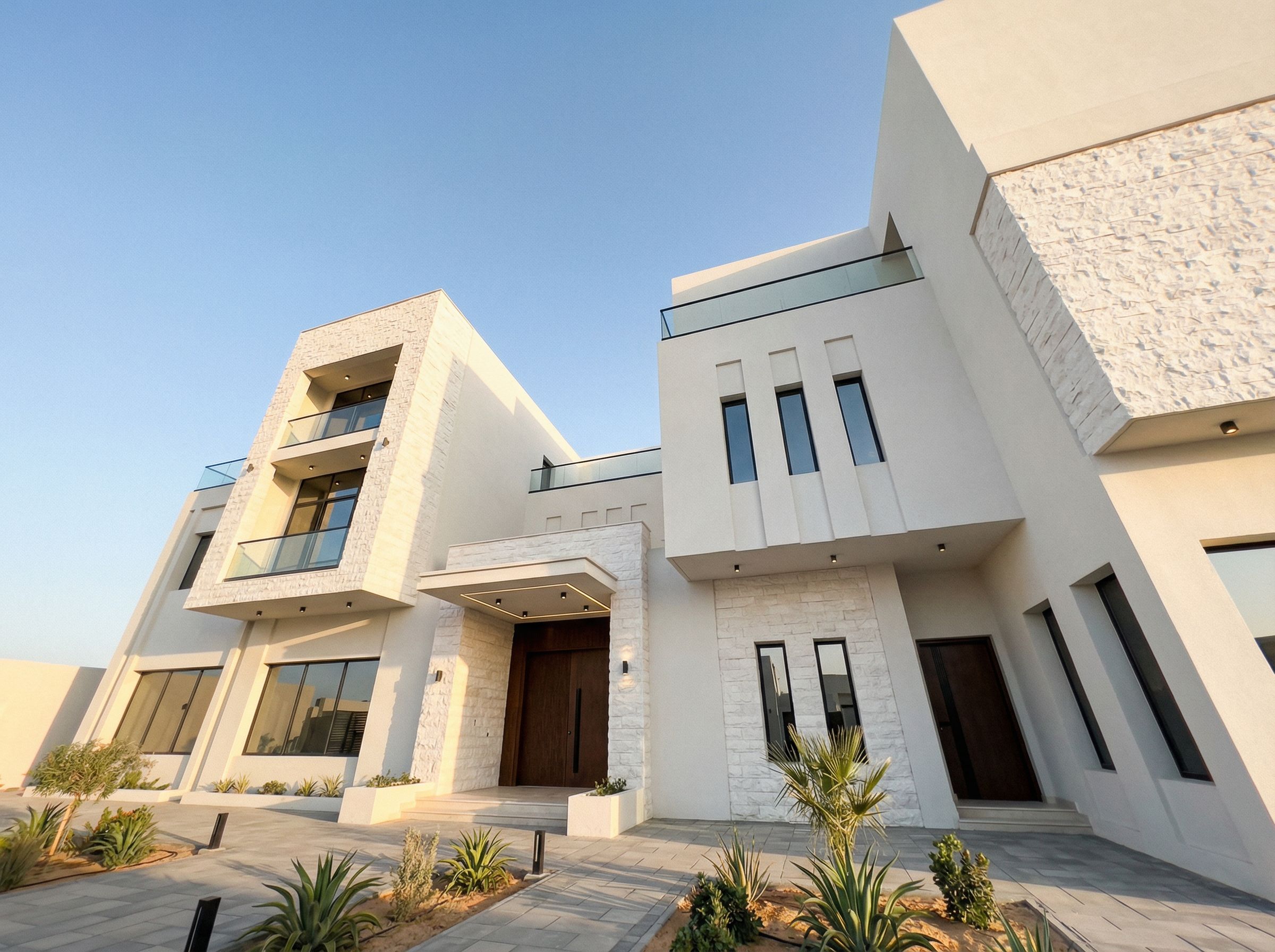 Prompt قدم تصميم للفيلا بطراز موردن مع بعض التفاصيل من ديكورات الحجر ناصع البياض مع تقديم تصميم مميز للمدخل, keep exact camera angle