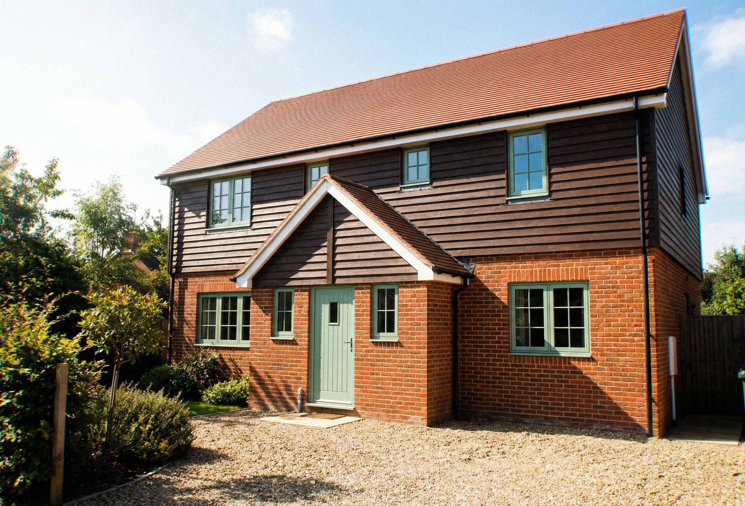 new house enclosed front projection 1.5 meters, red brick to ground floor soldier course over windows, dark brown horizontal timber boarding over, Chartwell green windows and front door, Terracoatta smooth roof tiles, white facia and soffit, gravel driveway frontage, shrubs, sunny day, small trees to left hand side, keep exact camera angle