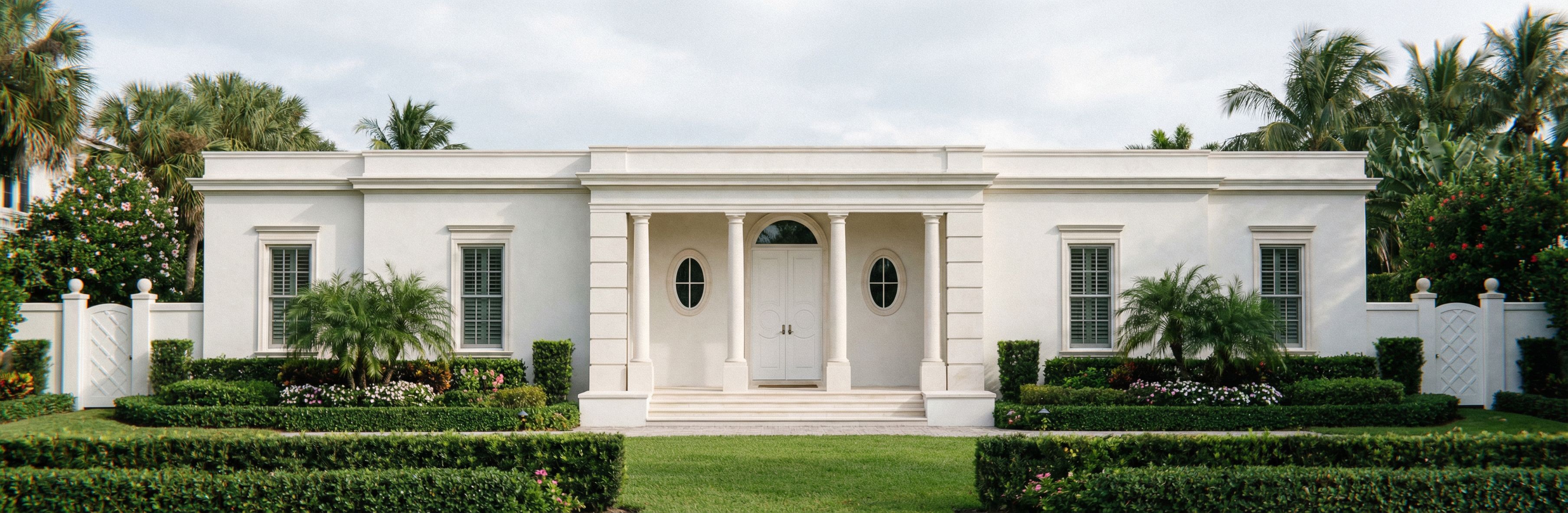 Ultra-photorealistic architectural exterior render of a Regency / Neo-Palladian style residence with strict symmetry and equal proportions throughout the massing. Facade is classically ordered, balanced, and restrained, emphasizing harmony and hierarchy rather than ornament. The building features a covered portico with classical proportions, 6 feet in depth, projecting 2 feet beyond the most forward wall, centered on the primary elevation. Portico scale is refined and historically appropriate, neither oversized nor shallow. Exterior material is smooth white stucco with subtle natural variation and realistic surface texture. The front door should be white. slight variations in shades of white on the architectural elements that you would see naturally in a real life on a home. Openings are perfectly aligned vertically and horizontally, with consistent rhythm and proportion. No warped geometry, no exaggerated depths. Corners are sharp but realistic, with soft edge breaks. Soft natural daylight, lightly overcast or early afternoon sun, realistic global illumination, true shadows, and balanced exposure. Camera positioned at human eye level, straight-on elevation view, 35–45mm lens, professional architectural photography composition. Strictly classical proportions; no contemporary simplifications. Quiet, disciplined composition with emphasis on proportion over ornament. Elevation accurately follows the provided sketch and architectural intent. Glass is clear and realistic with subtle reflections and interior depth—never flat or glossy. Render quality comparable to high-end architectural photography, photorealistic, refined, and timeless. No stylization, keep exact camera angle This is the front of the house and it is located in Palm Beach Florida. Using the provided elevation draw create a front on render based on the architectural elements depicted. do not add or remove anything. this is a one story building , keep exact camera angle