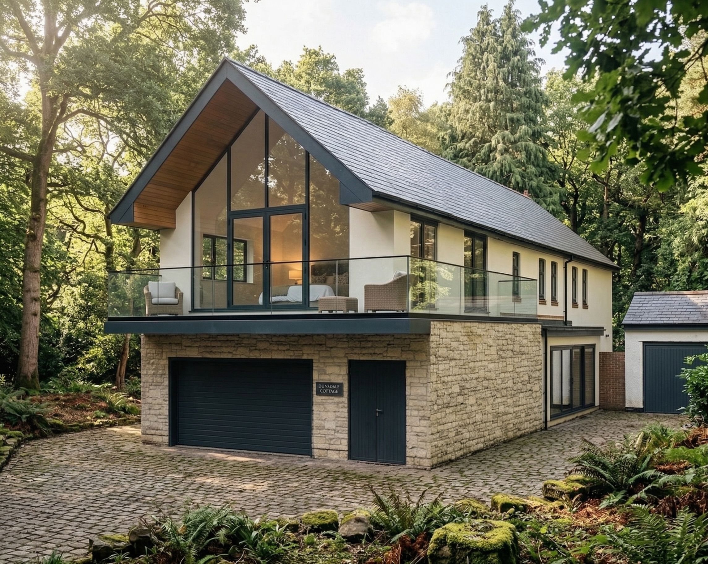 Render the image shown it is an extension to the existing property at Dunsdale cottage Frodsham. It is stet in deep woodland as seen in the reference photograph. The first photo shows the front view as it is showing how the extension looks and the materials used. and the second photo shows the woodland siting. The new extension is 7.5 meters long incorporation a garage on the ground floor and a bedroom on the first floor with full height glazed windows to the gable. there is a balcony with glass balustrade where the owners can sit outside. the roof is clad with slate, the walls are clad with stone on the ground floor and rendered walls above. it is a bright sunny day with the sunlight filtering through large mature woodland trees creating a dappled effect with the shadows. , keep exact camera angle