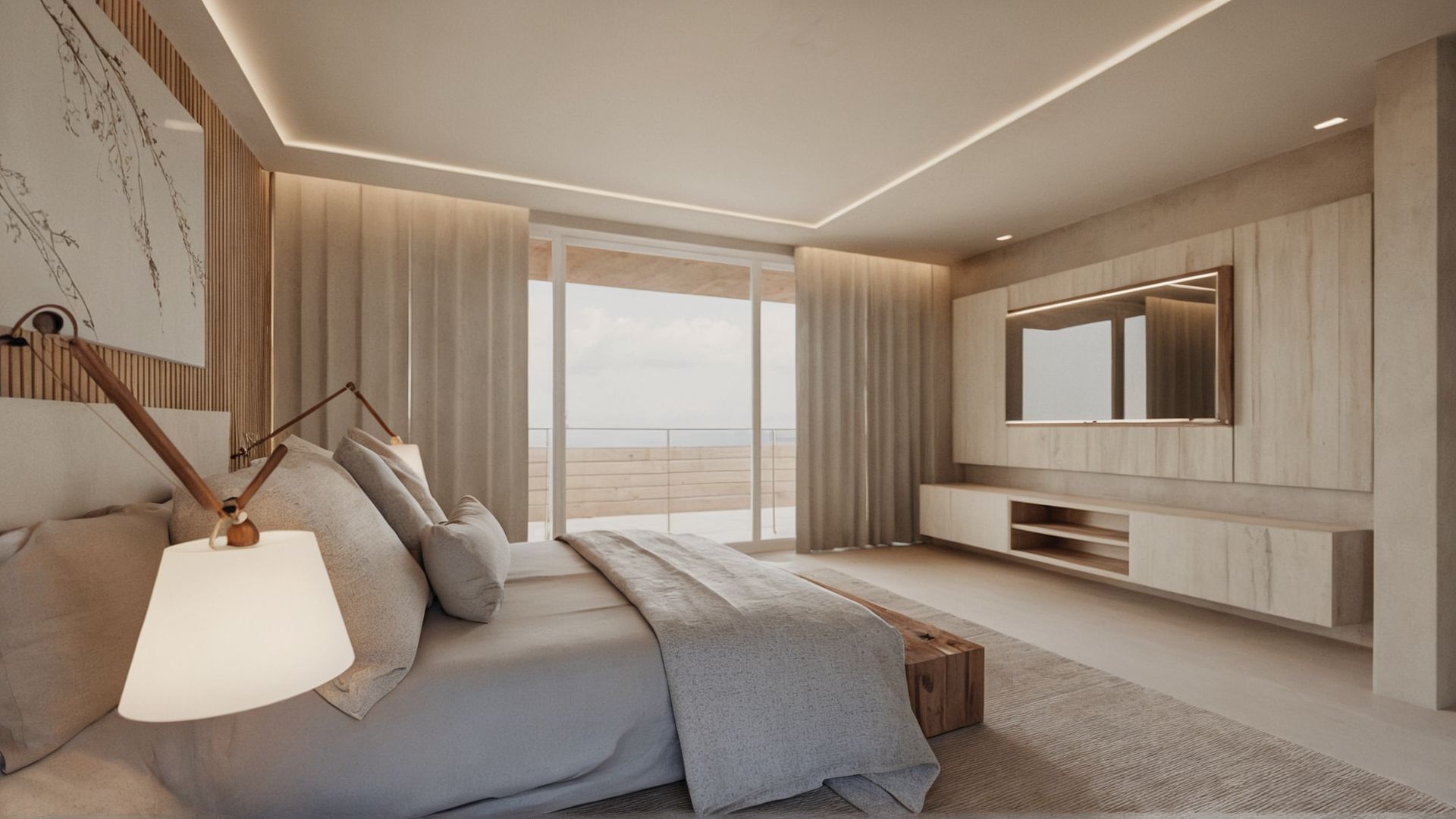 PromptPhoto of a modern bedroom featuring a minimalist design, with wooden paneling and soft neutral tones. Emphasize the sleek textures of the bedding and the warm tones of the wooden bench. The lighting is soft and ambient, highlighting the natural daylight streaming through the windows. Shot from a corner angle to capture the spaciousness, with a focus on the cozy, inviting atmosphere. Use a wide-angle lens to enhance depth and perspective, showcasing the integrated bathroom area in the background, promoting a sense of open living.g light grey wood. decorative objects wabi sabi