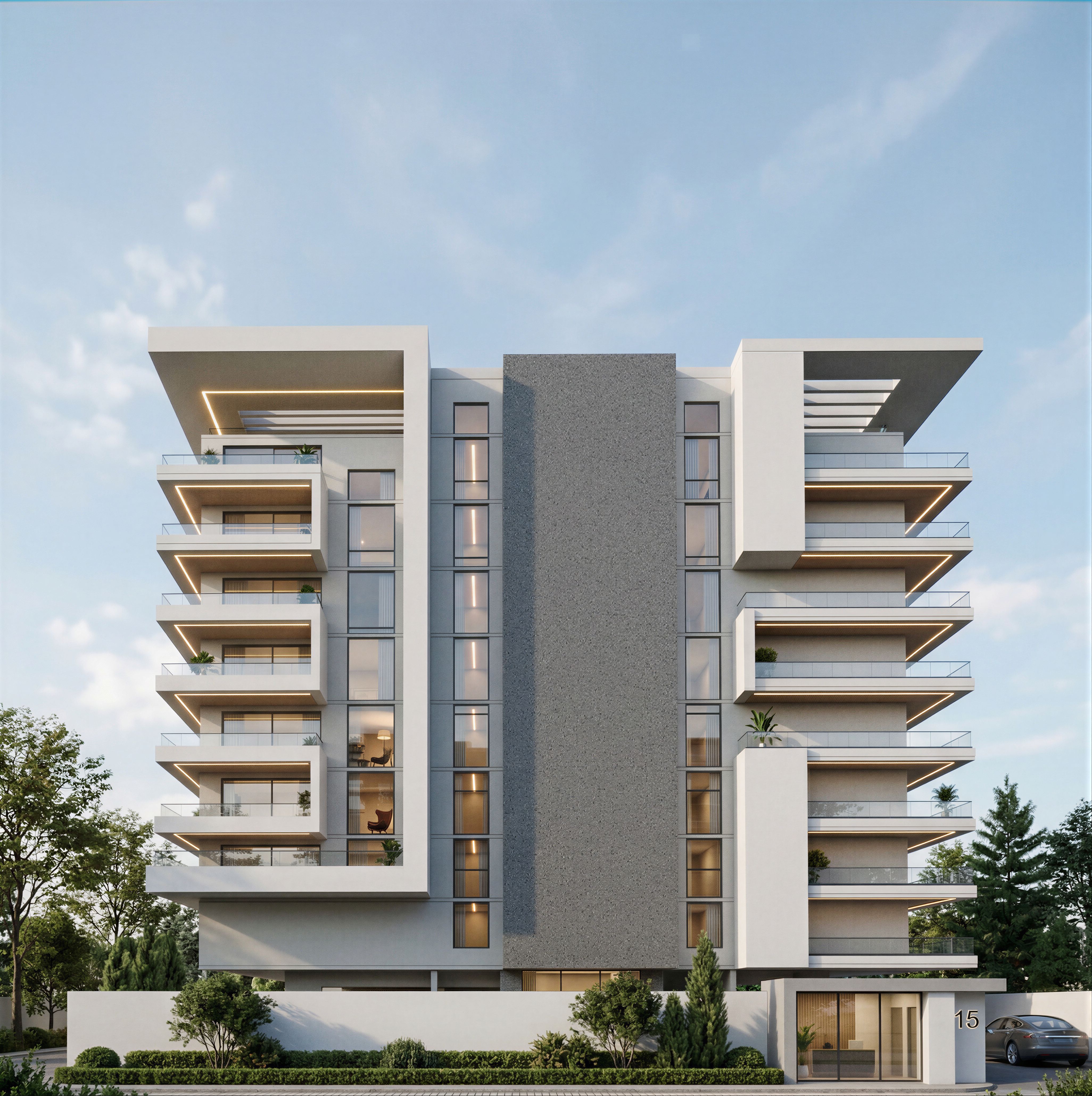 EnhancedPromptA beautiful photo-realistic render of a modern apartment building featuring clean, elegant lines and well-framed glass panels. Sleek glass railings accent the balconies, highlighting the building’s contemporary form. Subtle ambient daylight reflects softly off the glazing, revealing warm interior furnishings and refined material textures inside. There are some walls and under-slab reveals hosting linear striplights with warm light. Wall themes is predominantly White & light grey, entrance gate house has some curtain wall glazing on the front. The exterior environment is highly detailed — landscaped walkways, gentle shadows, realistic vegetation, and calm, ultra-sharp details, accurate reflections., keep exact camera angle