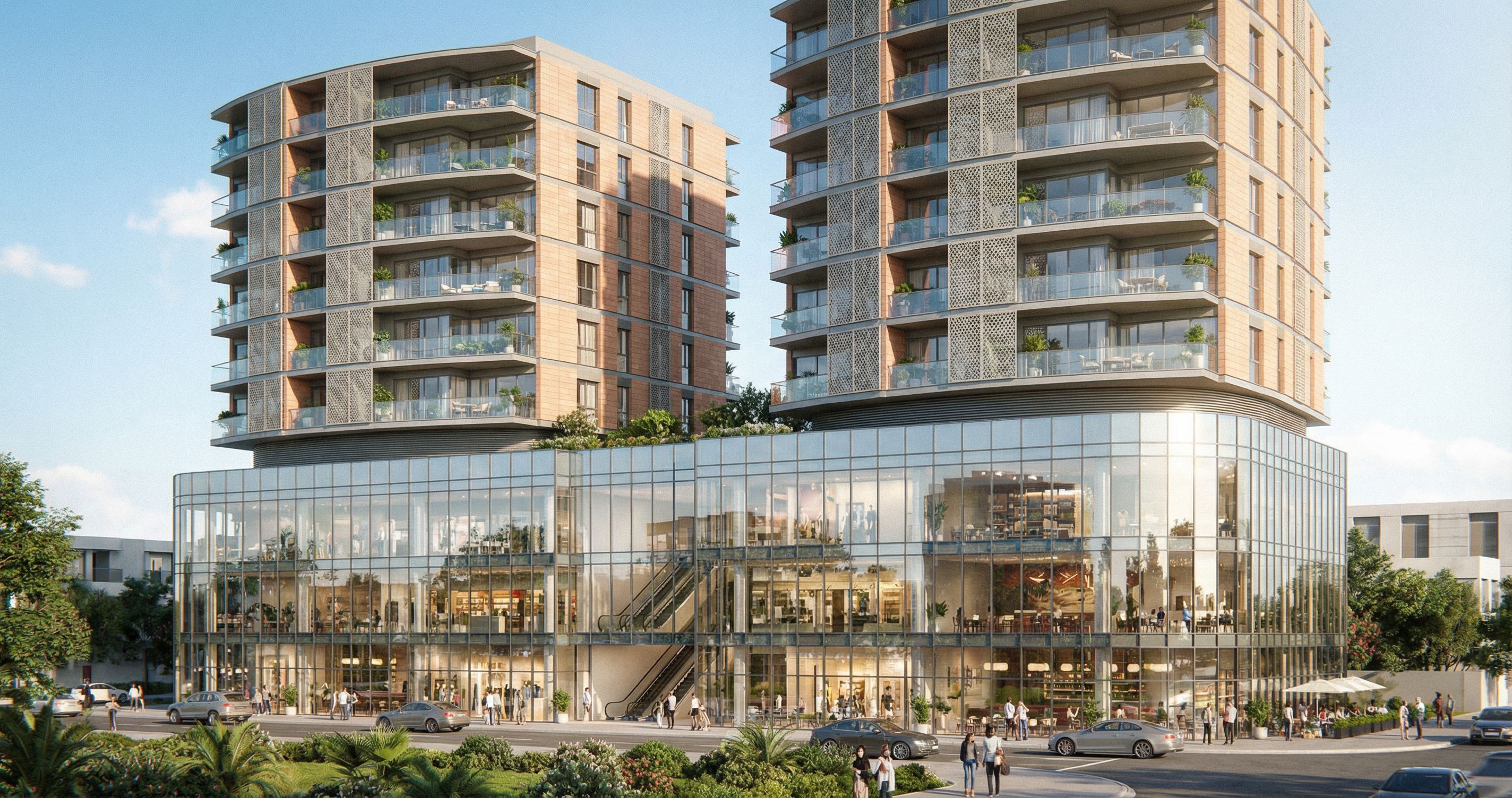 THIS IS A TWO RESIDENTIAL BUILDINGS 10 STORIES FOR EACHON A PODIUM WHICH IS A MALL COMMERCIAL CENTER FOUR STORIES ;MAKE THIS UILDING SUPER REAL AND ALIVE THE RESIDENTIAL TOWERS MUST LOOK ALIVE AND THE MALL MUST LOOK ICONIC,, DON'T CHNGE THE SCALE OF THE BUILDING DON'T CHANGE THE CAMERA ANGLE OR THE FRAME OF IT .. ;MAKE THE MALL CLADDED IN GLASS CHOOSE MATERIALS THAT CAN MAKE THE BUILDING LOOK LIGHTER IN WHEIGHT , keep exact camera angle