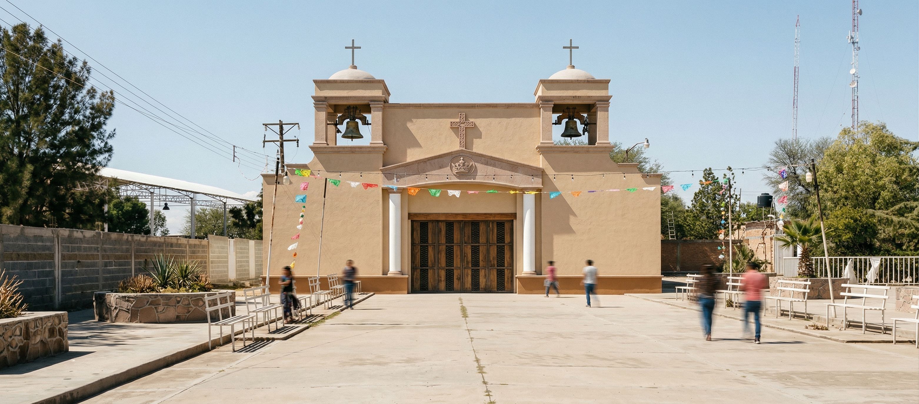 PromptFoto de la fachada de una iglesia tradicional con campanarios prominentes rematados con cúpulas, hechas con estuco beige cálido y portones metálicos como en la imagen de referencia, las molduras están hechas de piedra de cantera, las columnas son blancas, coloca la imagen original en el centro de la imagen de referencia, respetando el entorno que la rodea donde se encuentra, Se respeta el diseño de la imagen original,en el centro del frontón tiene una corona tallada en relieve bajo y en la punta del frontón una cruz de piedra de cantera, en cada torre campanario contiene su campana en la parte superior